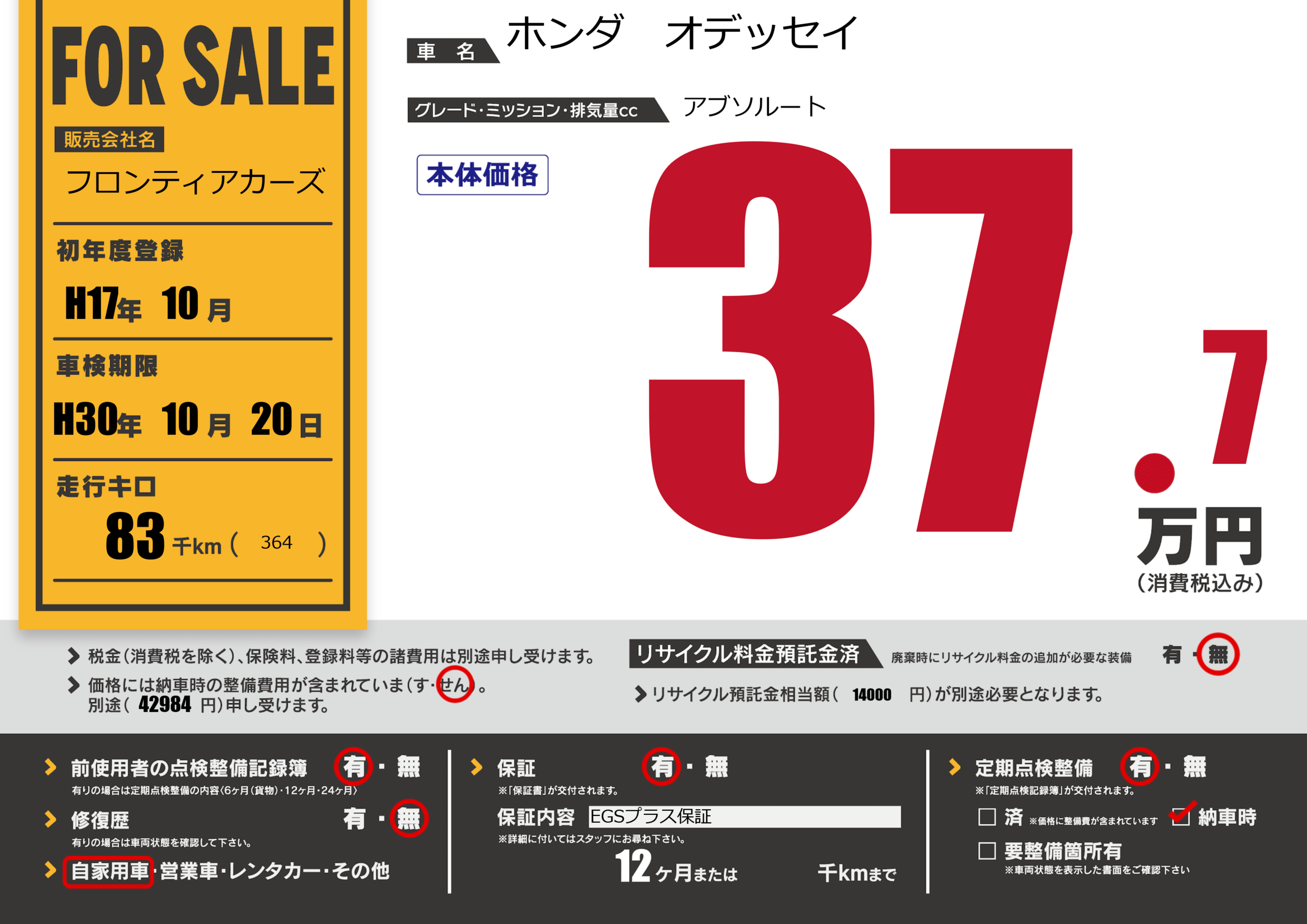 | 車名 | ホンダ オデッセイ(売約済) | グレード ミッション 排気量 |