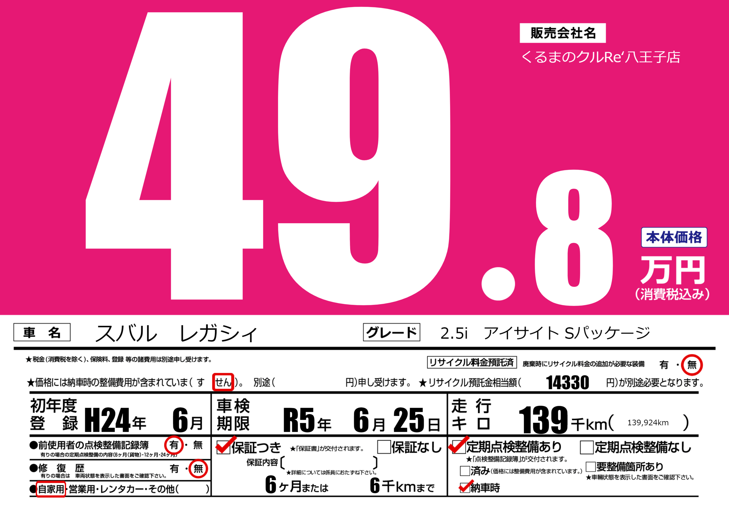 | 走行キロ | 13.9万km | 初年度登録 | H24年6月 |
