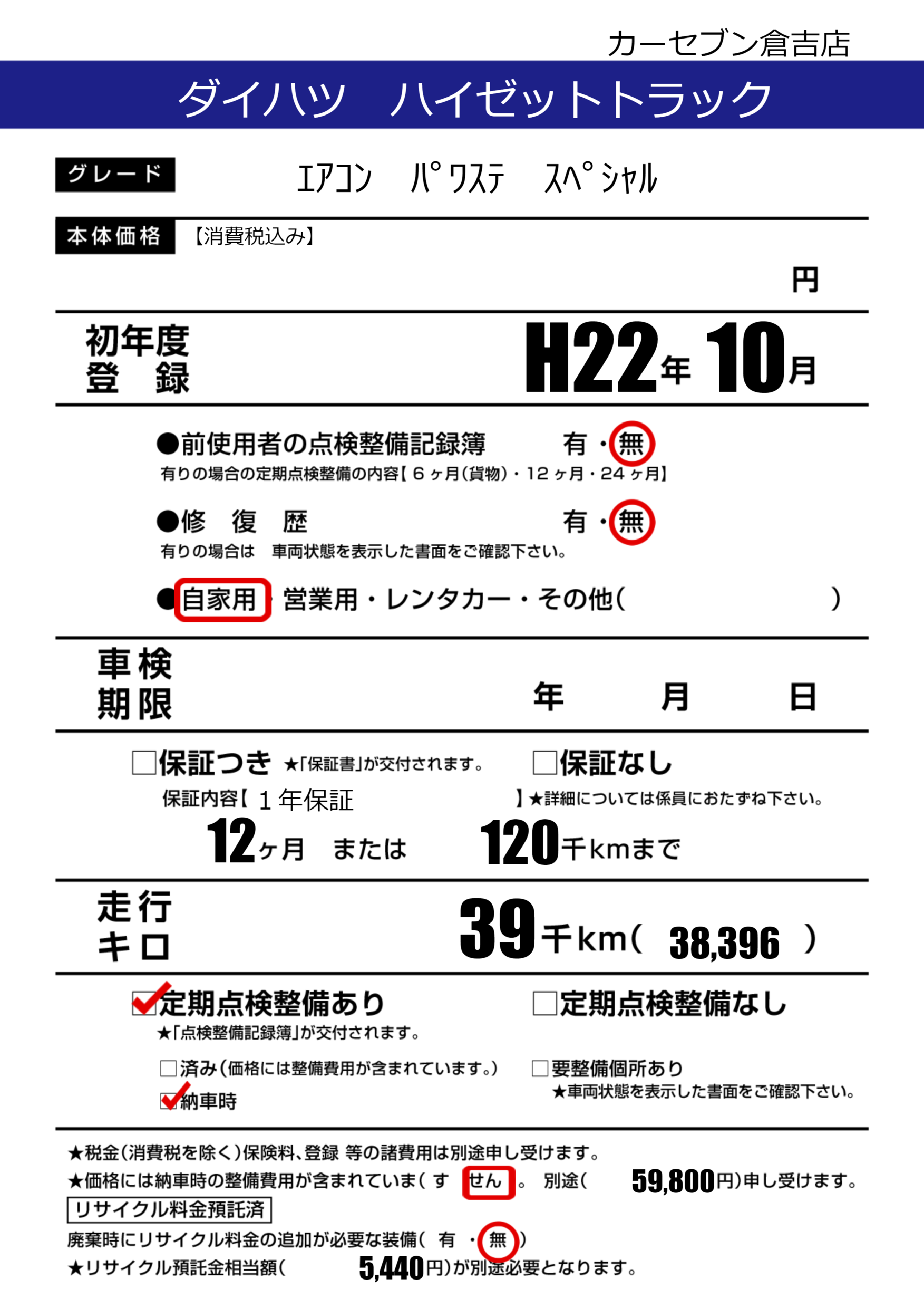 | 走行キロ | 3.9万km | 初年度登録 | H22年10月 |