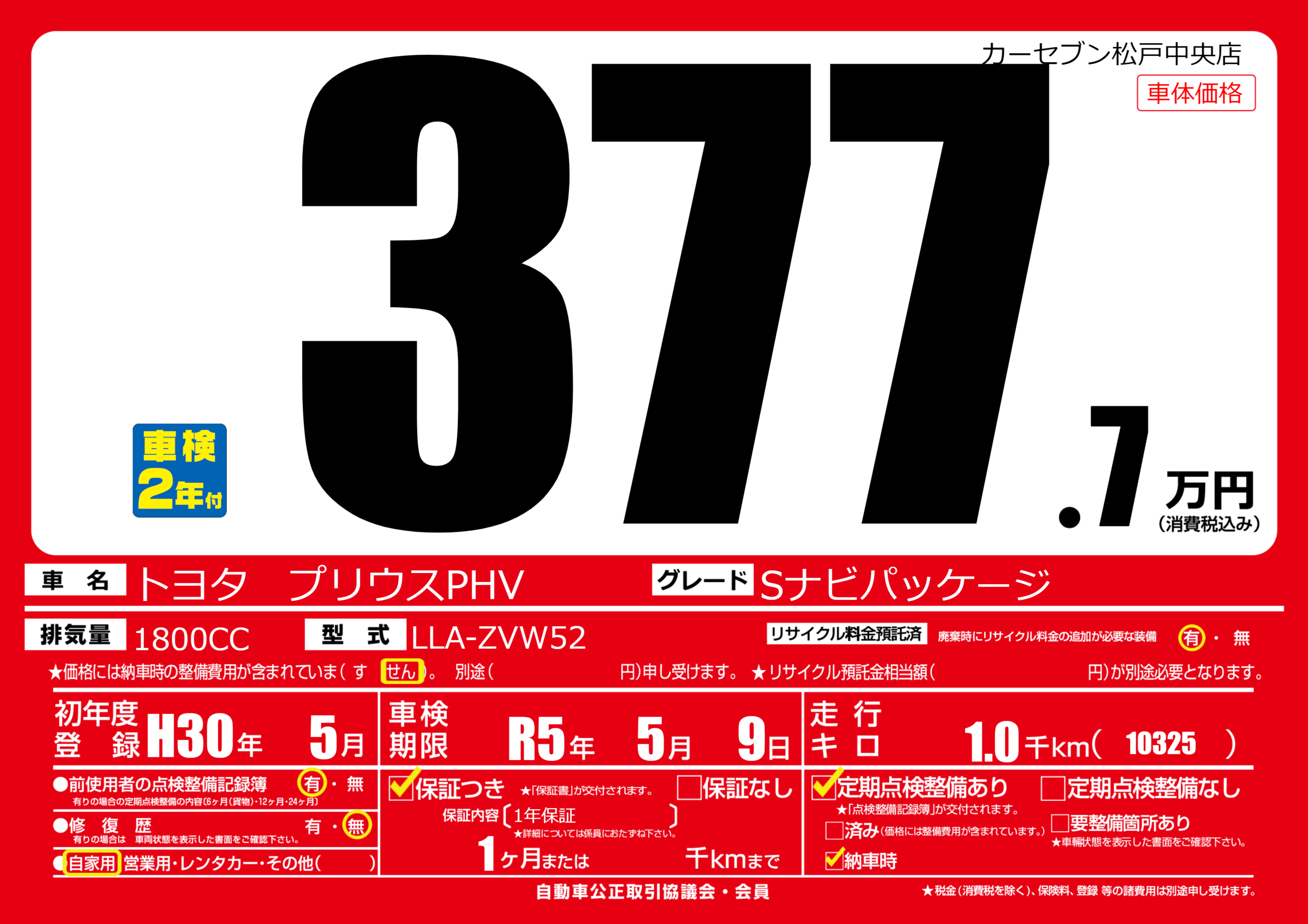 | 車名 | トヨタ プリウスPHV | グレード ミッション 排気量 |