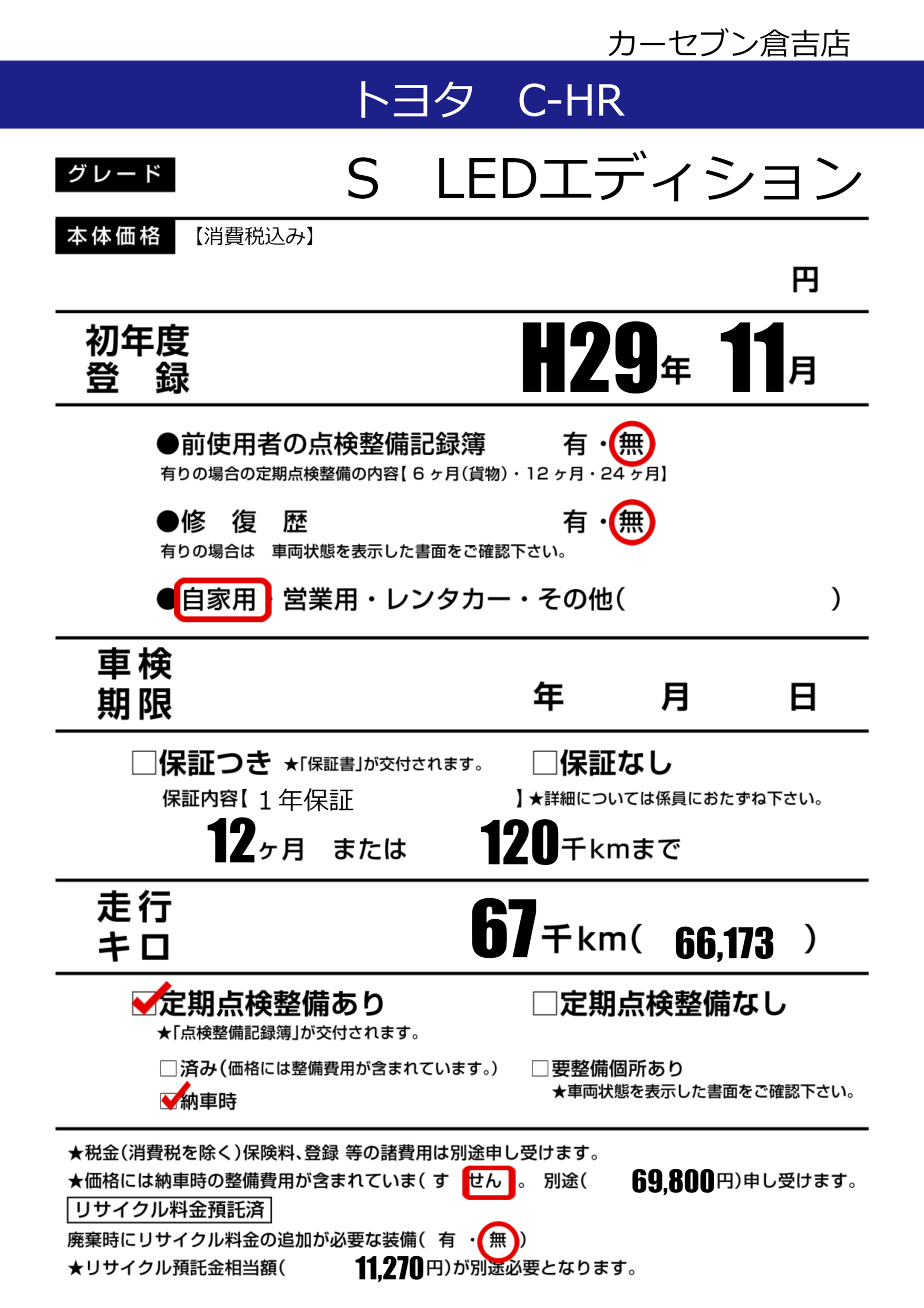 | 定期点検整備 | 定期点検整備あり 納車時あり | ||