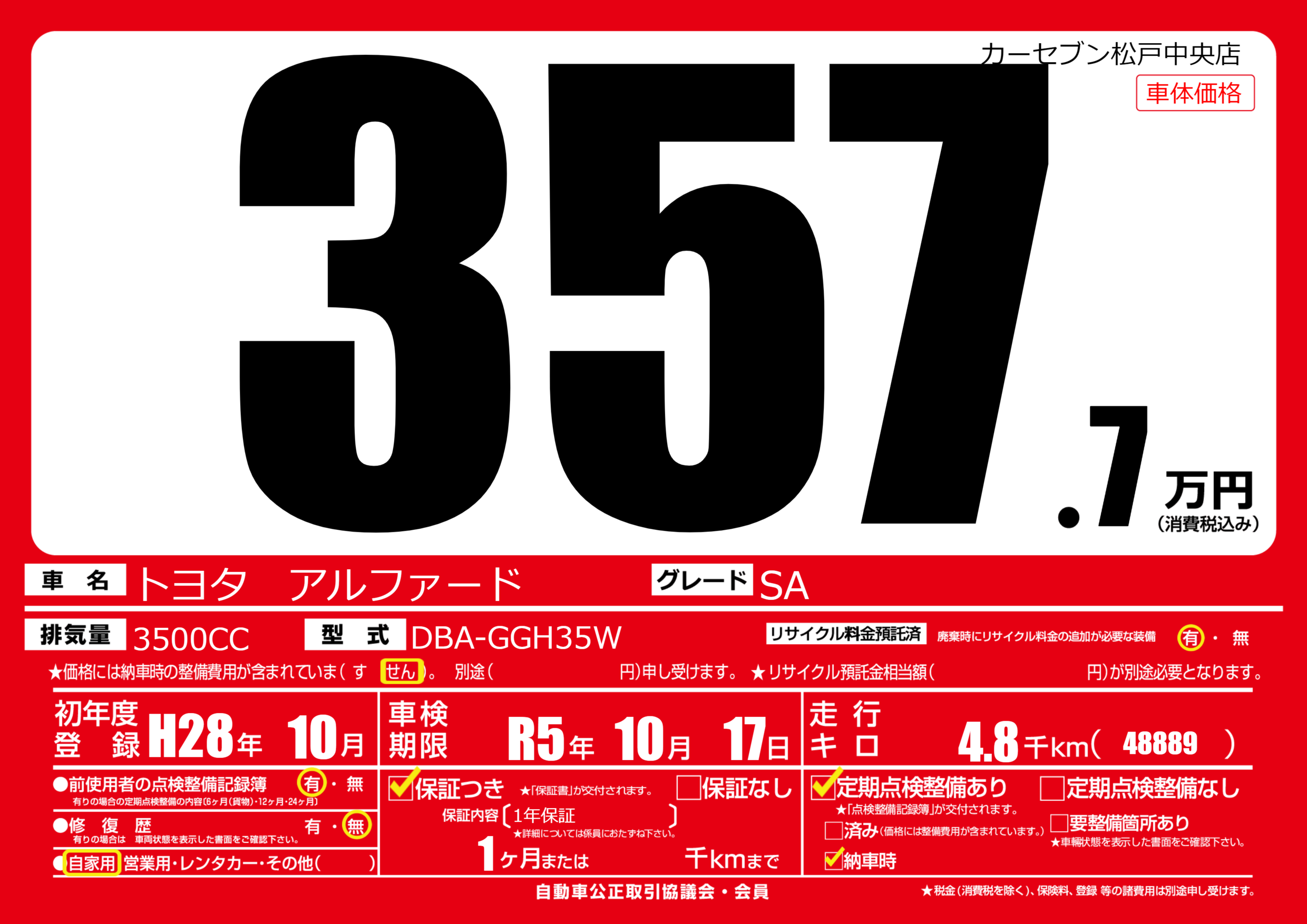| 車名 | トヨタ アルファード | グレード ミッション 排気量 |