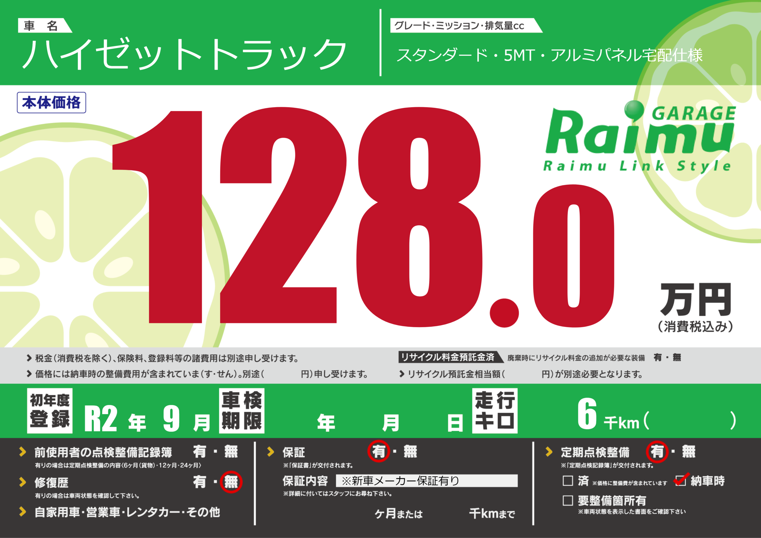 | 車名 | ハイゼットトラック | グレード ミッション 排気量 |