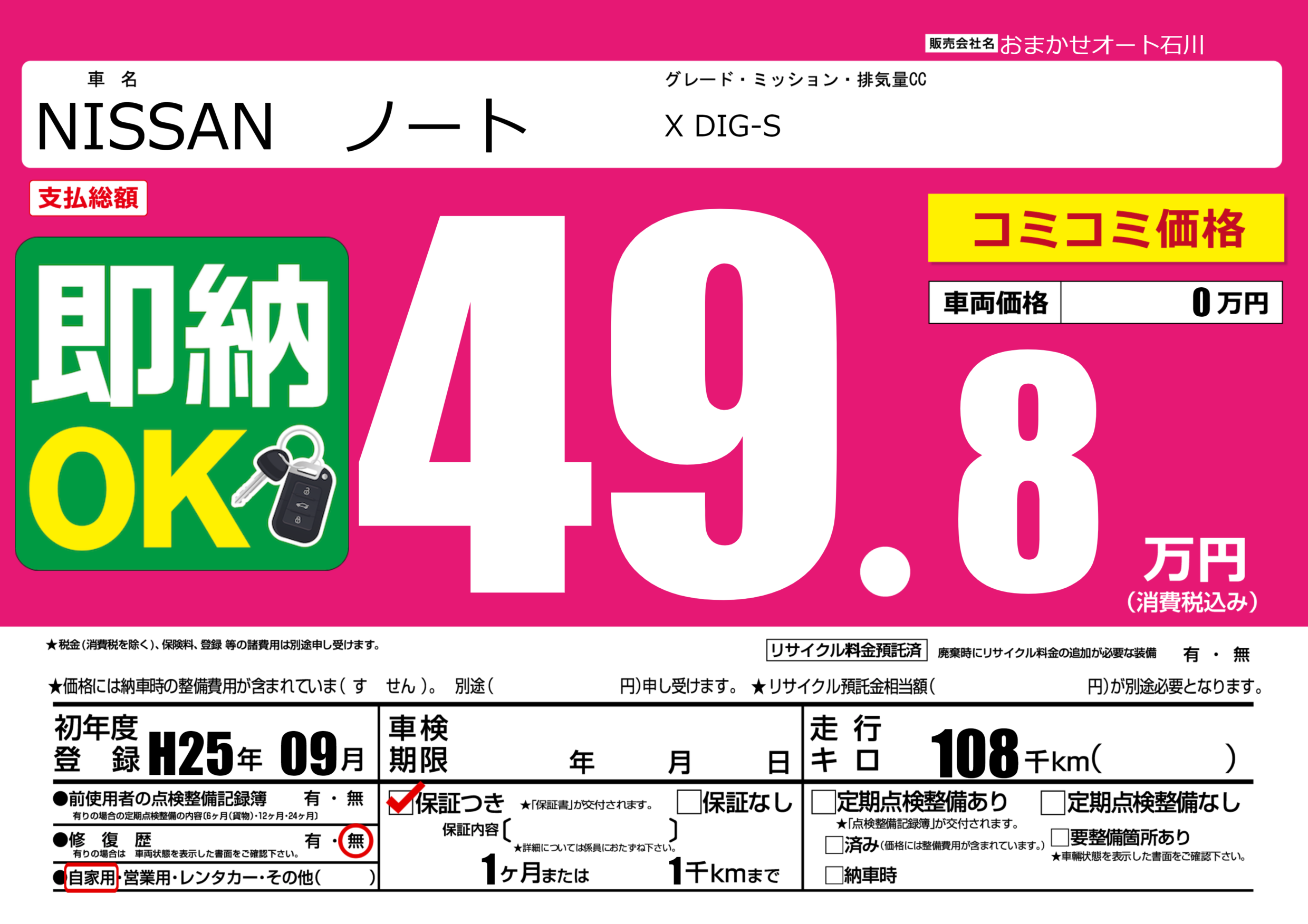 | 車名 | NISSAN ノート | グレード ミッション 排気量 |