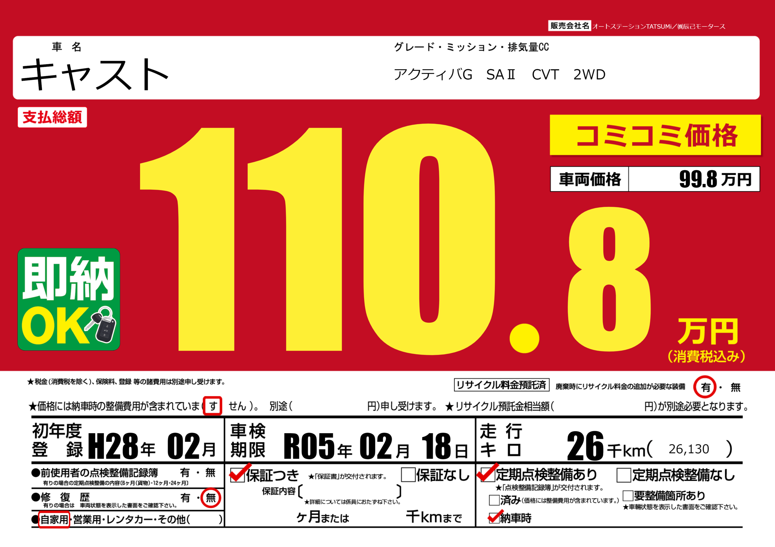 | 定期点検整備 | 定期点検整備あり 納車時あり | ||