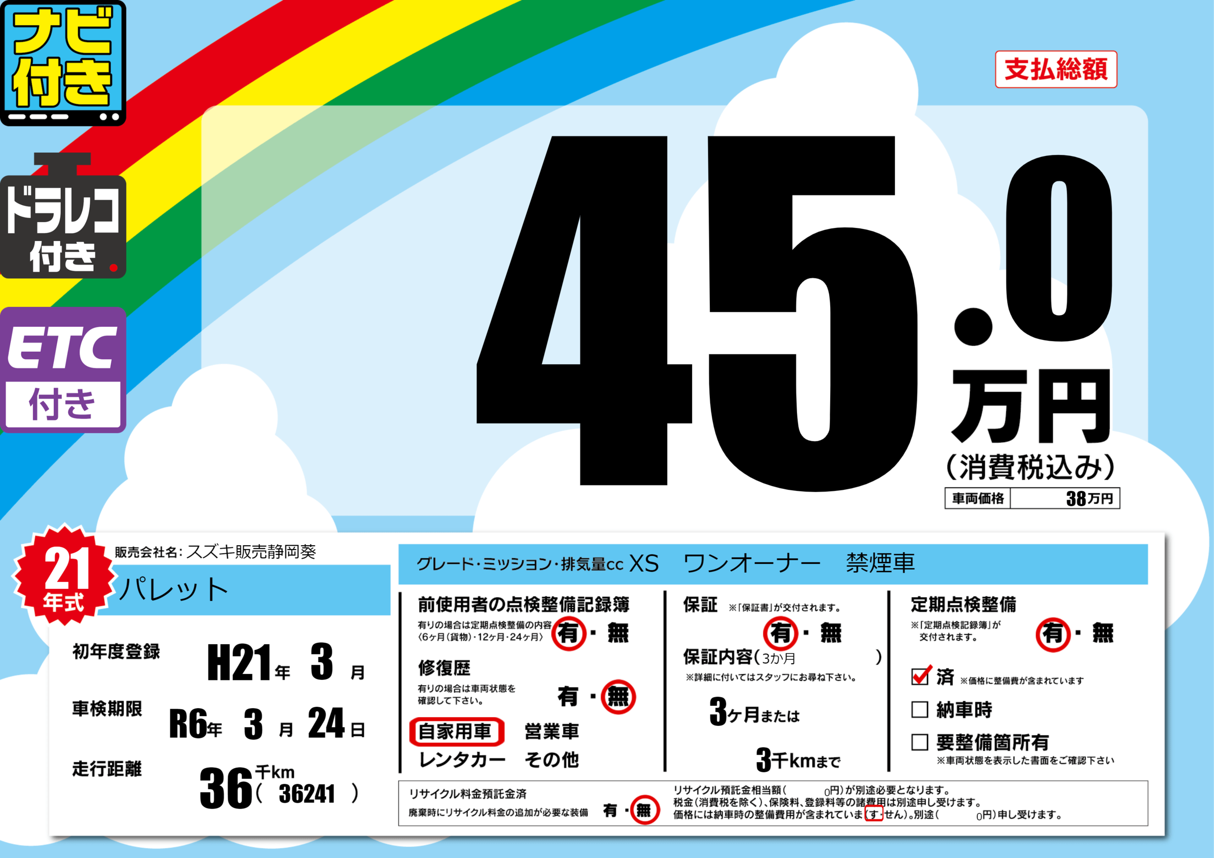 | 走行キロ | 3.6万km | 初年度登録 | H21年3月 |