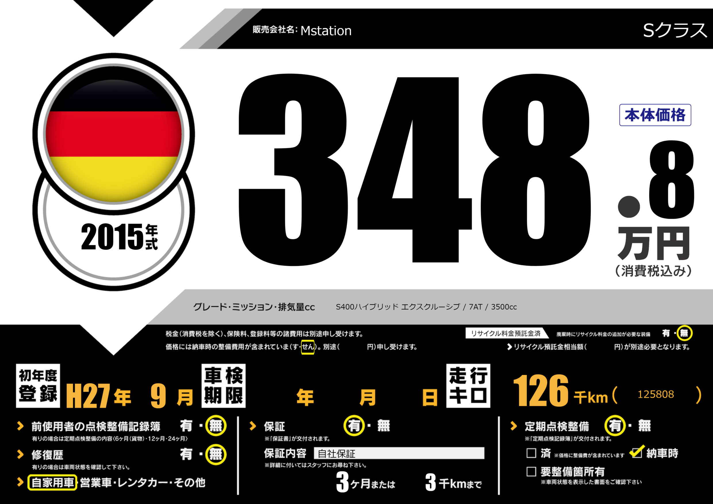 | 走行キロ | 12.6万km | 初年度登録 | H27年9月 |