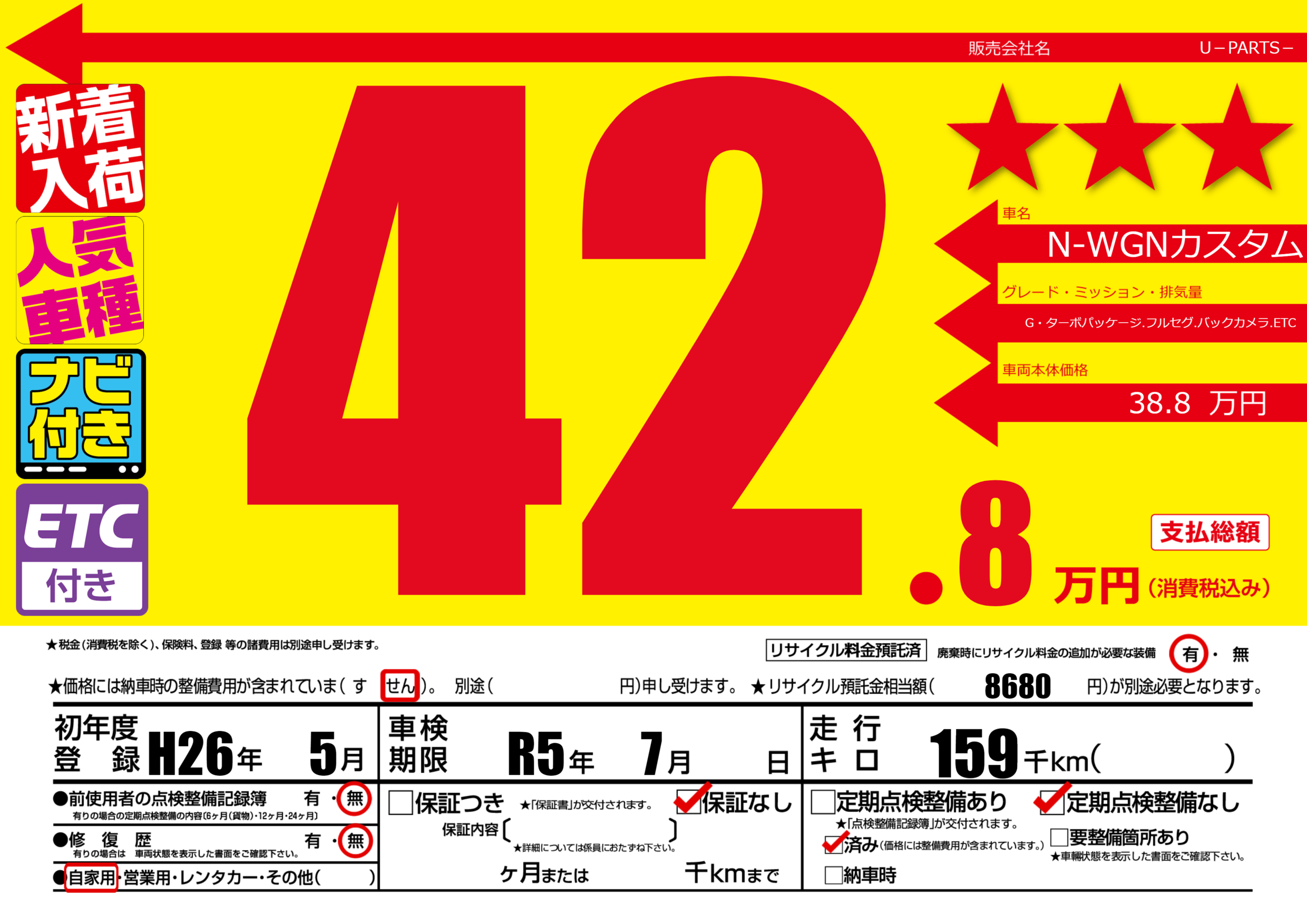 | 車名 | N-WGNカスタム | グレード ミッション 排気量 |