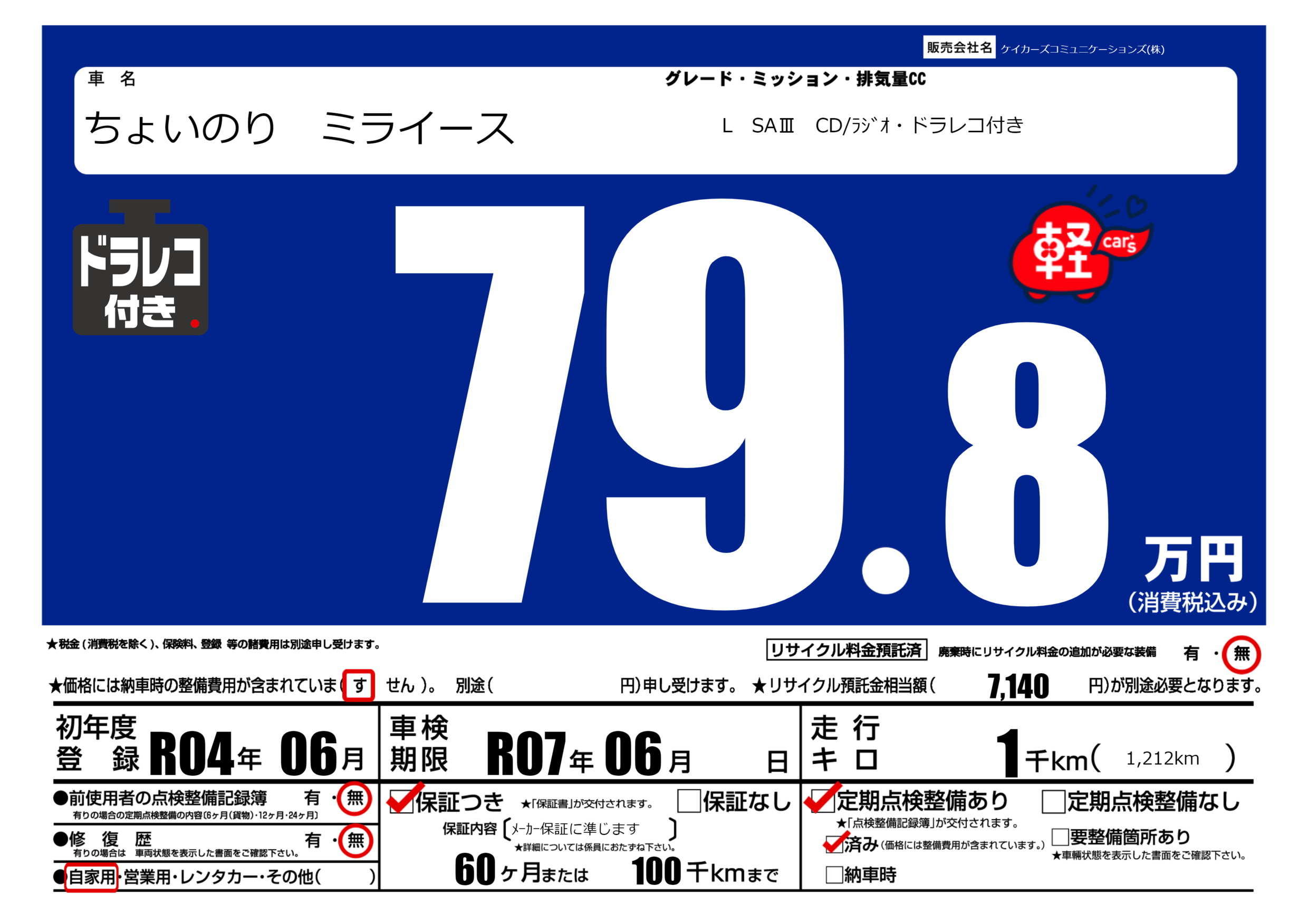 | 定期点検整備 | 定期点検整備あり 定期点検整備済み | ||