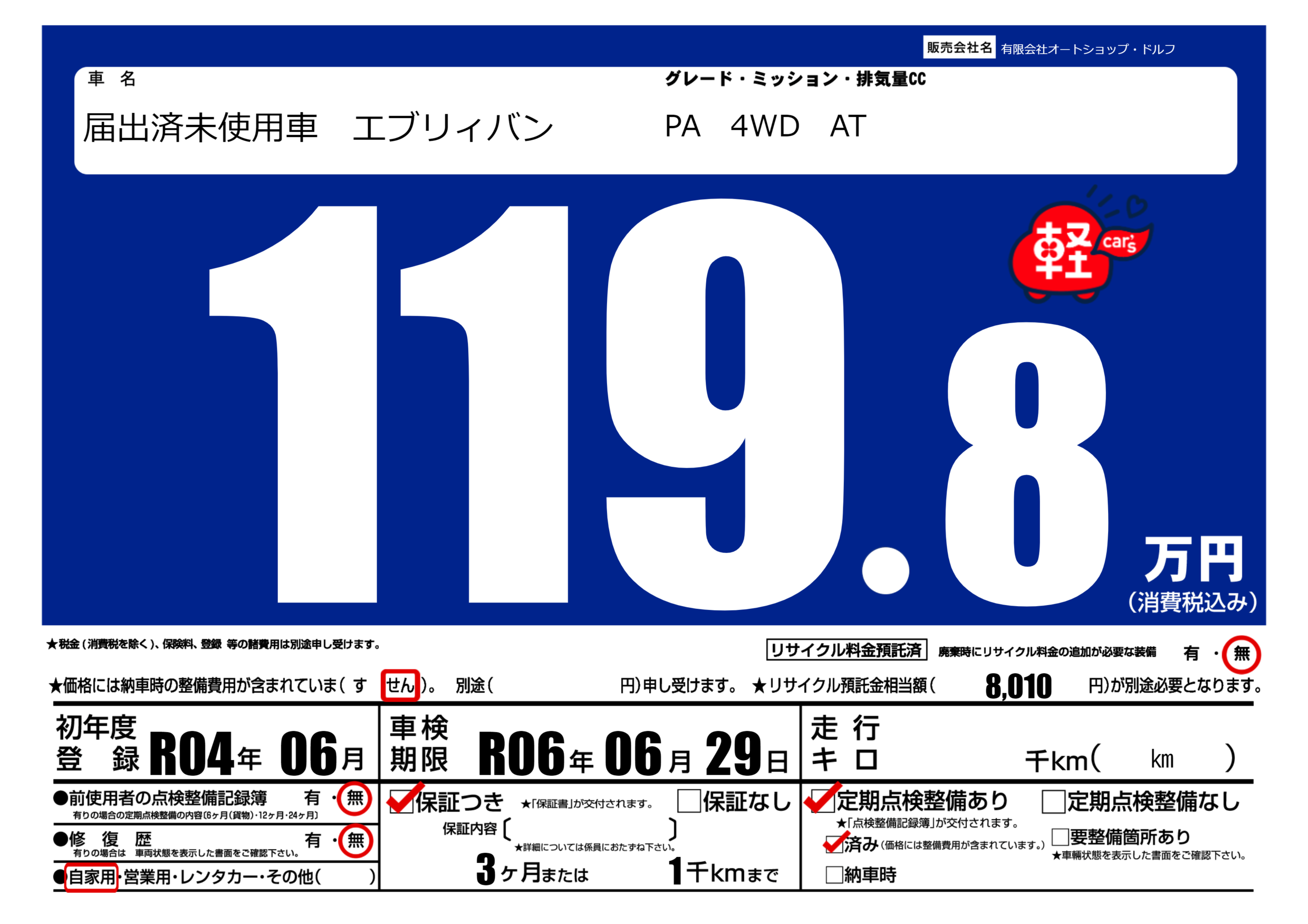 | 車名 | 届出済未使用車 エブリィバン | グレード ミッション 排気量 |