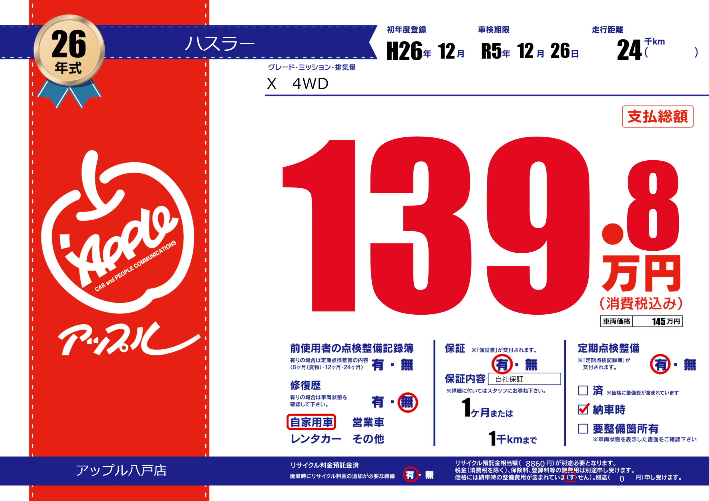 | 車名 | ハスラー | グレード ミッション 排気量 |