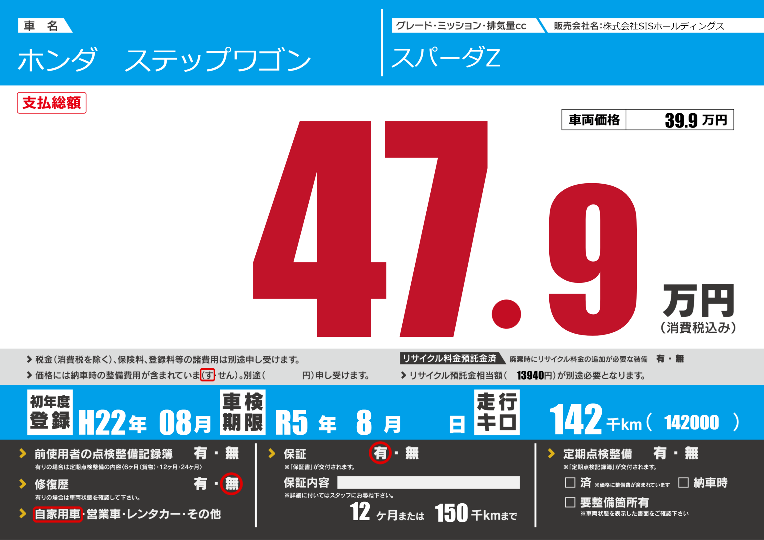 保証付き 保証内容(---) 12ヶ月または(150)千kmまで |