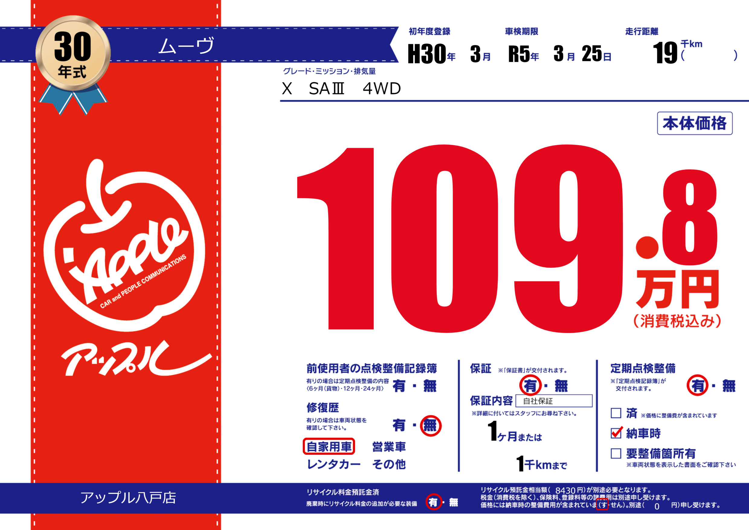 保証付き 保証内容( 自社保証) 1ヶ月または(1)千kmまで |