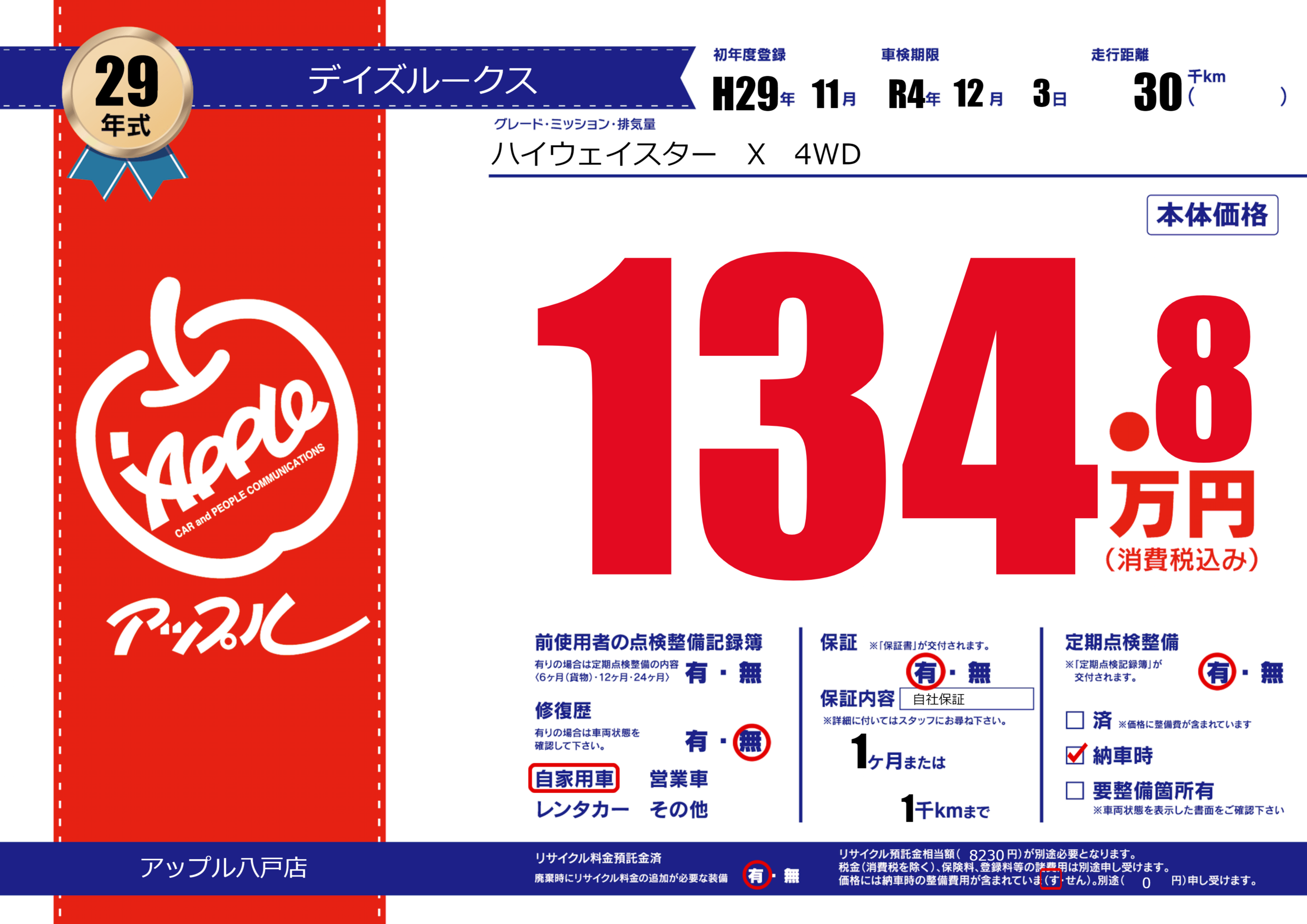 | 走行キロ | 3万km | 初年度登録 | H29年11月 |
