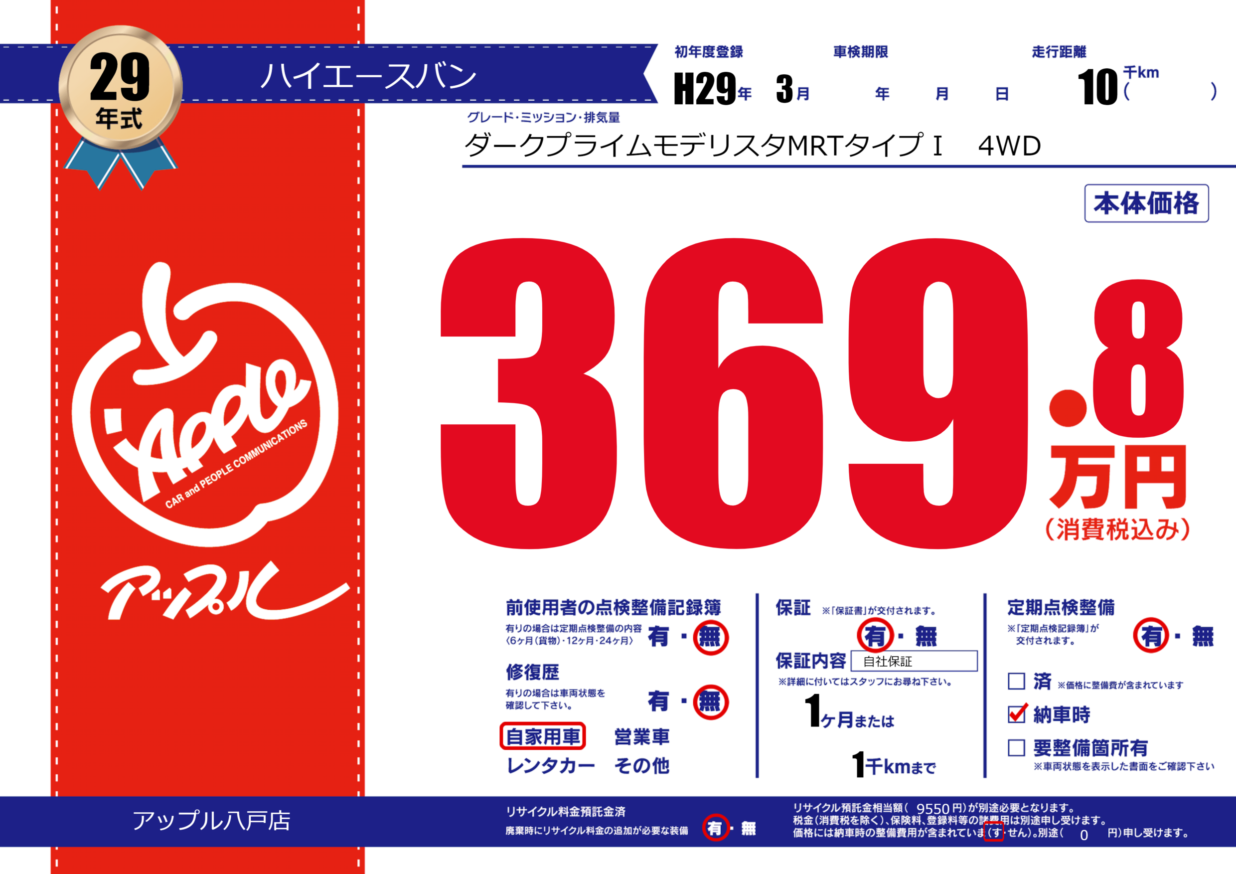 | 走行キロ | 1万km | 初年度登録 | H29年3月 |