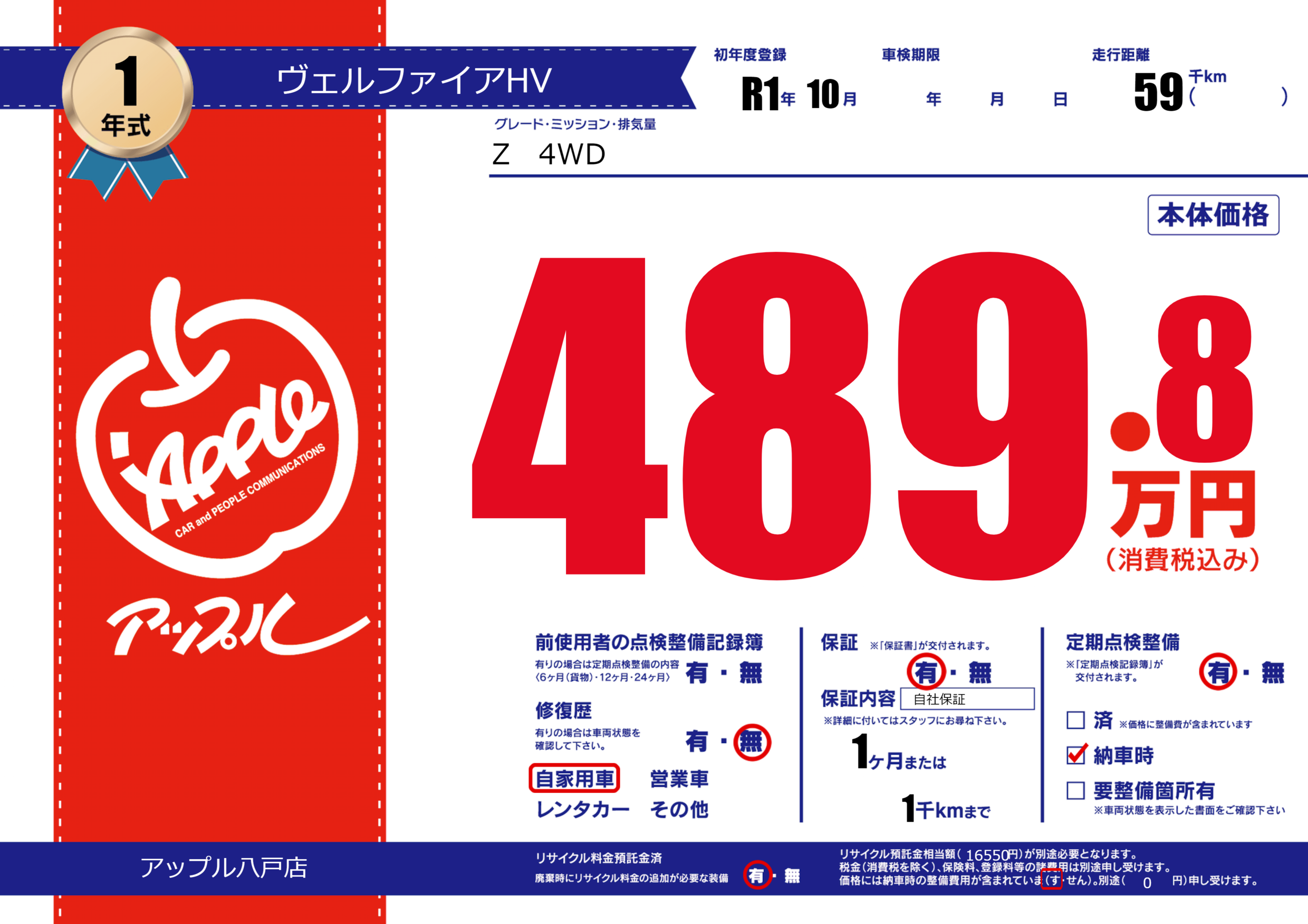 保証付き 保証内容( 自社保証) 1ヶ月または(1)千kmまで |