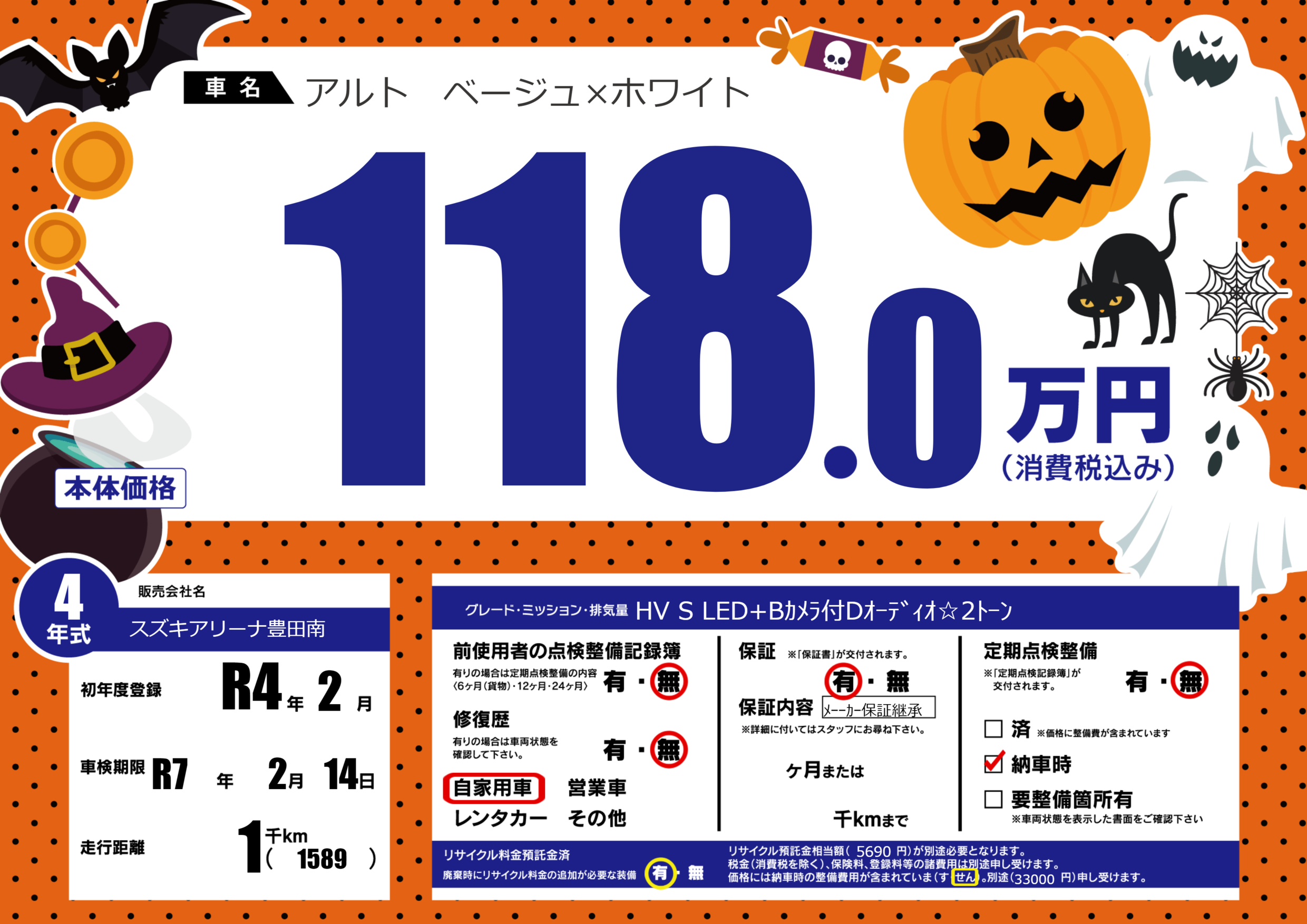| 車名 | アルト ベージュ×ホワイト | グレード ミッション 排気量 |