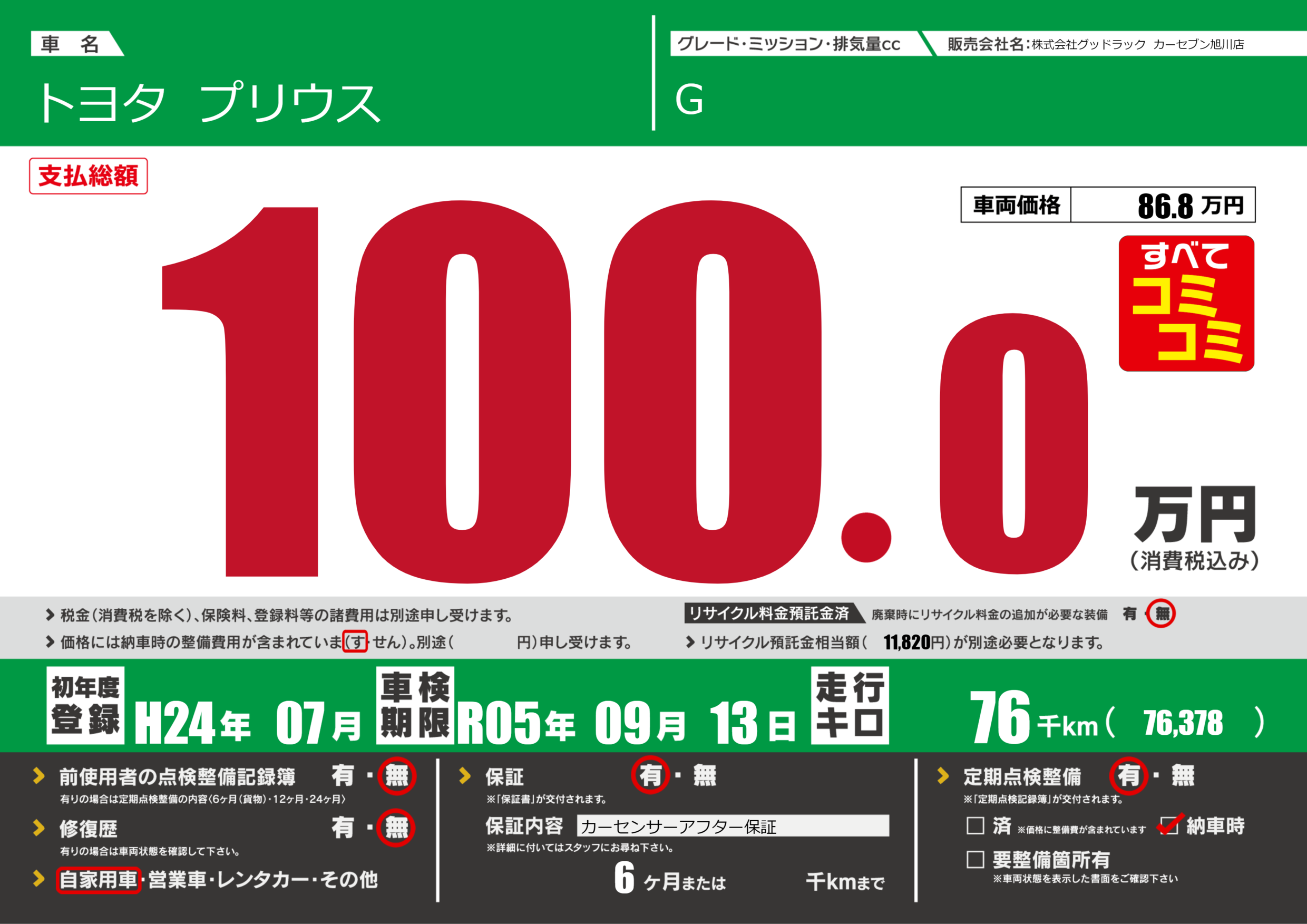 | 車名 | トヨタ プリウス | グレード ミッション 排気量 |