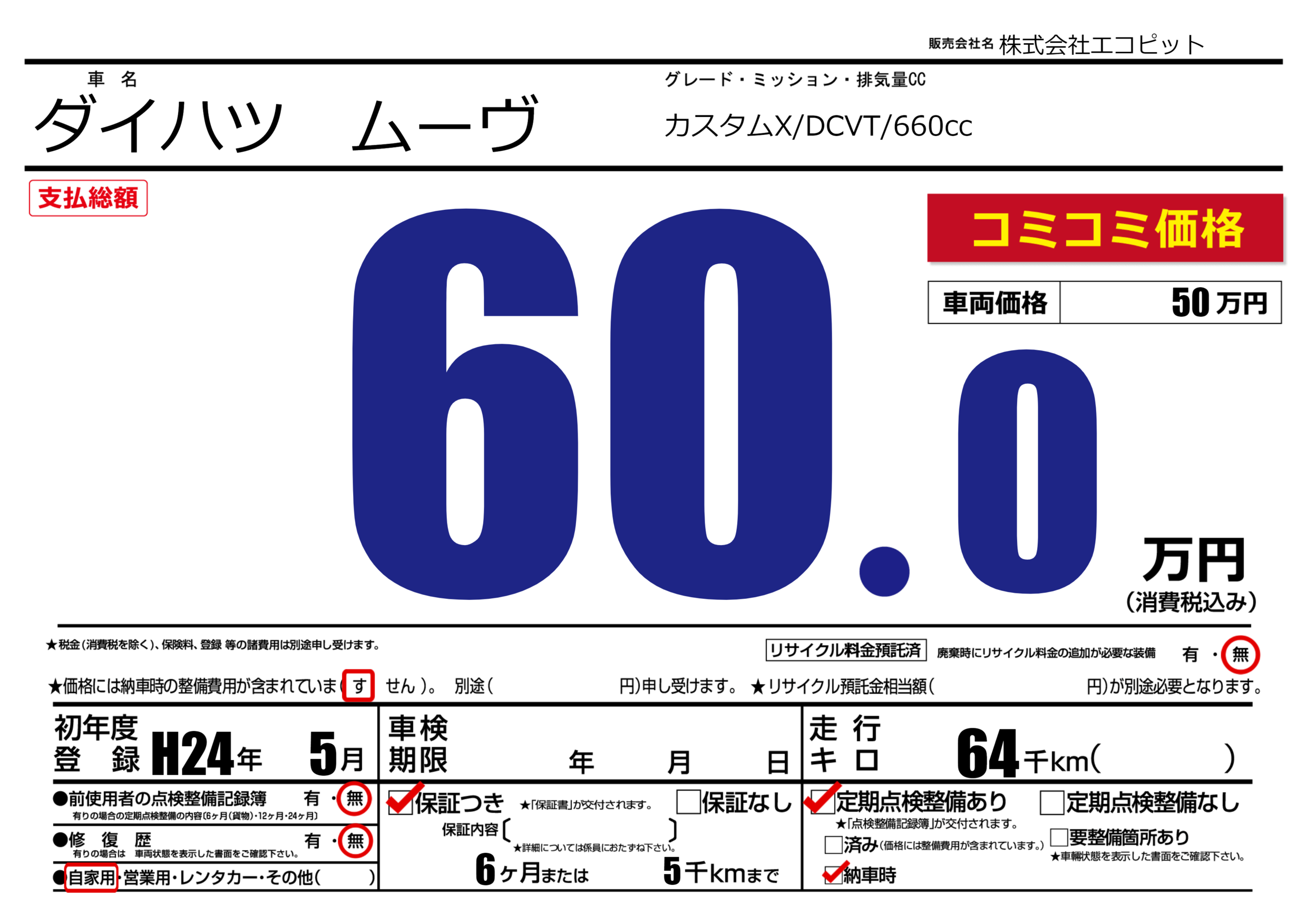 | 車名 | ダイハツ ムーヴ | グレード ミッション 排気量 |