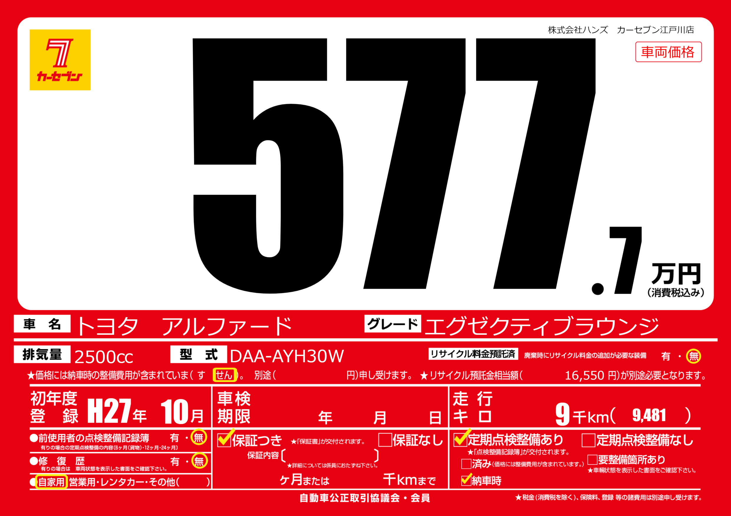 | 車名 | トヨタ アルファード | グレード ミッション 排気量 |