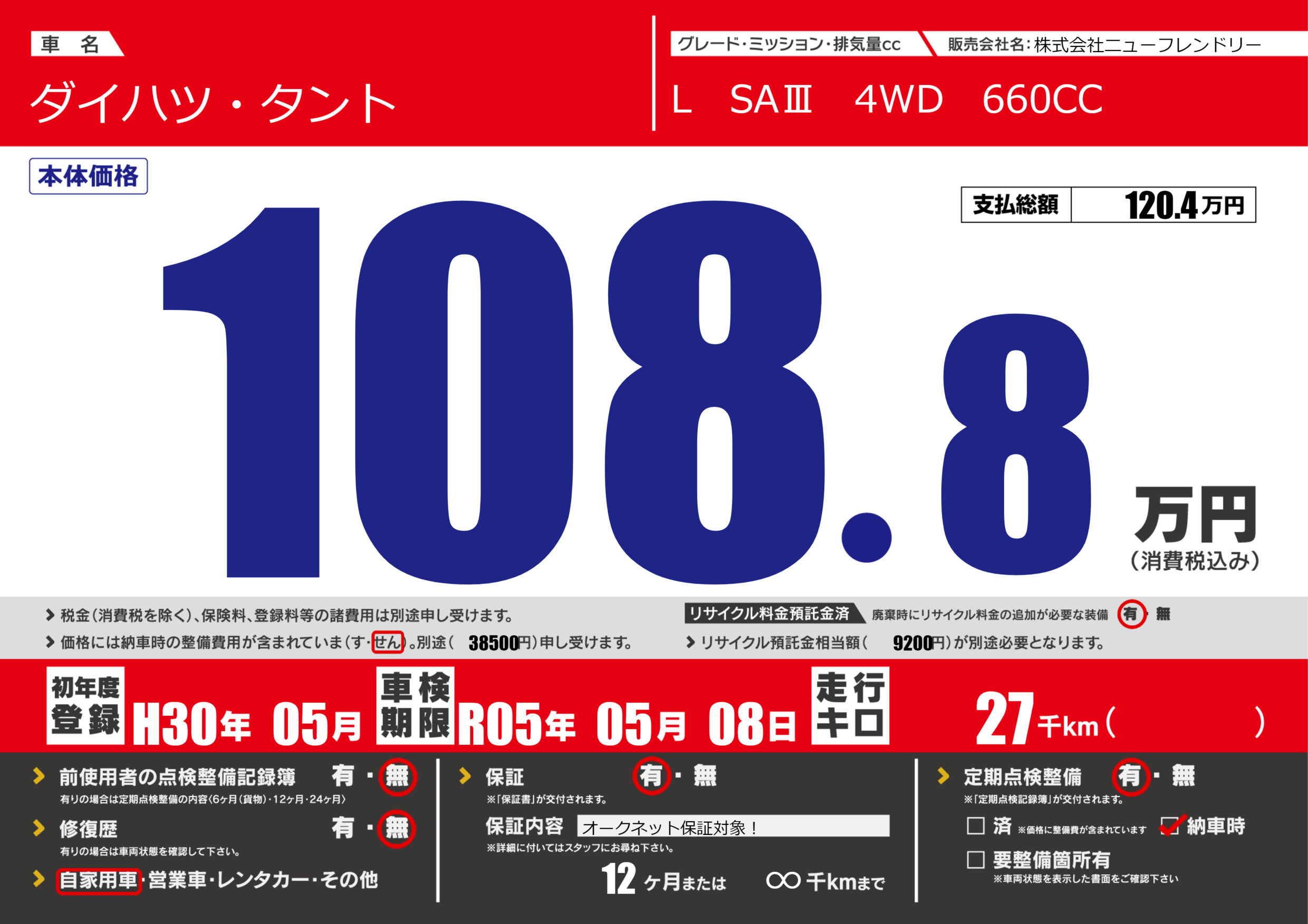 | 車名 | ダイハツ・タント | グレード ミッション 排気量 |