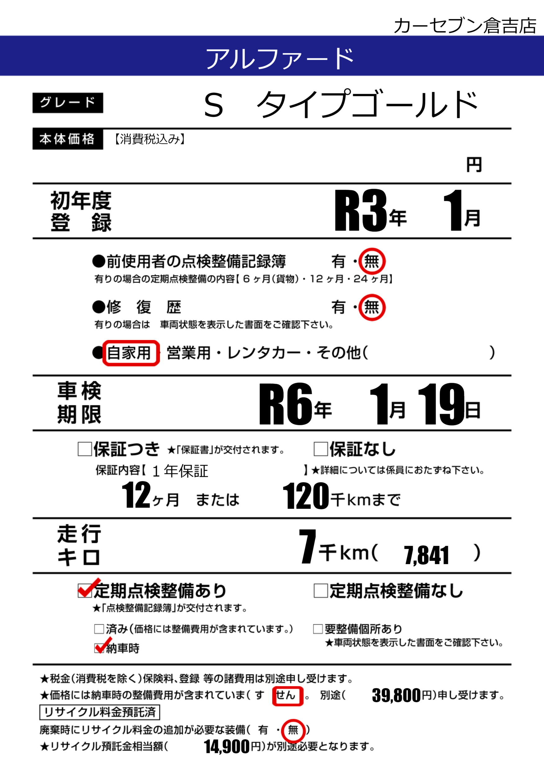| 車名 | アルファード | グレード ミッション 排気量 |