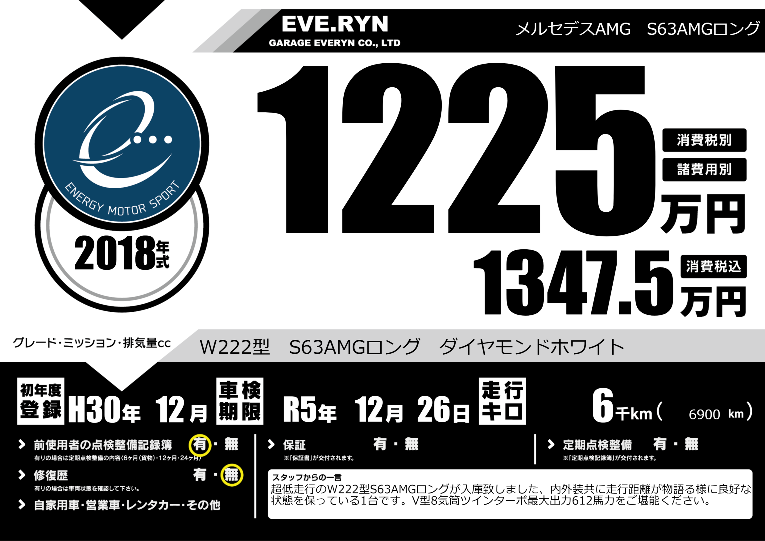 | 走行キロ | 0.6万km | 初年度登録 | H30年12月 |