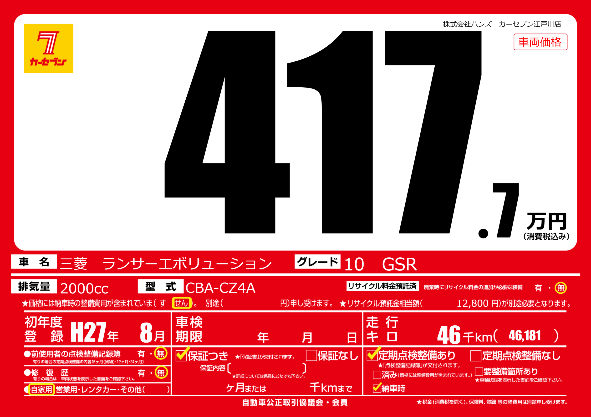 | 車名 | 三菱 ランサーエボリューション | グレード ミッション 排気量 |