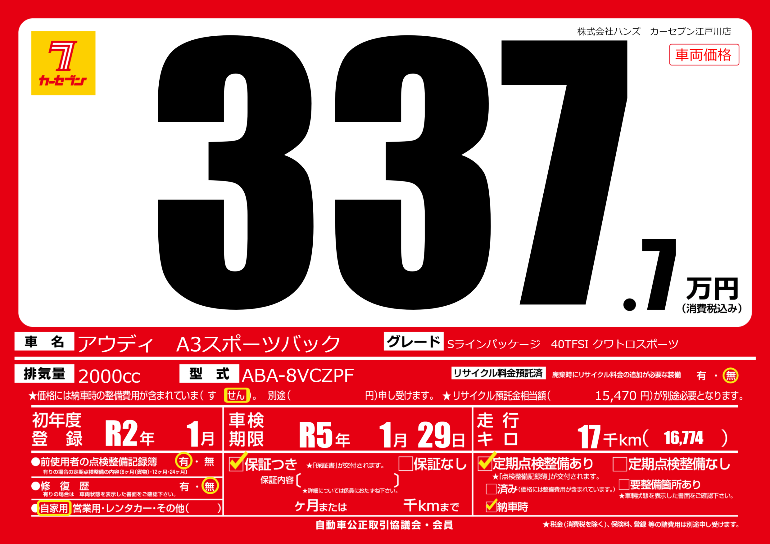 | 車名 | アウディ A3スポーツバック | グレード ミッション 排気量 |