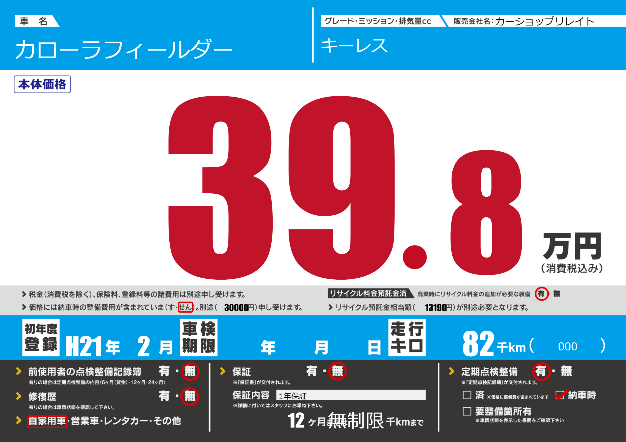 | 車名 | カローラフィールダー | グレード ミッション 排気量 |