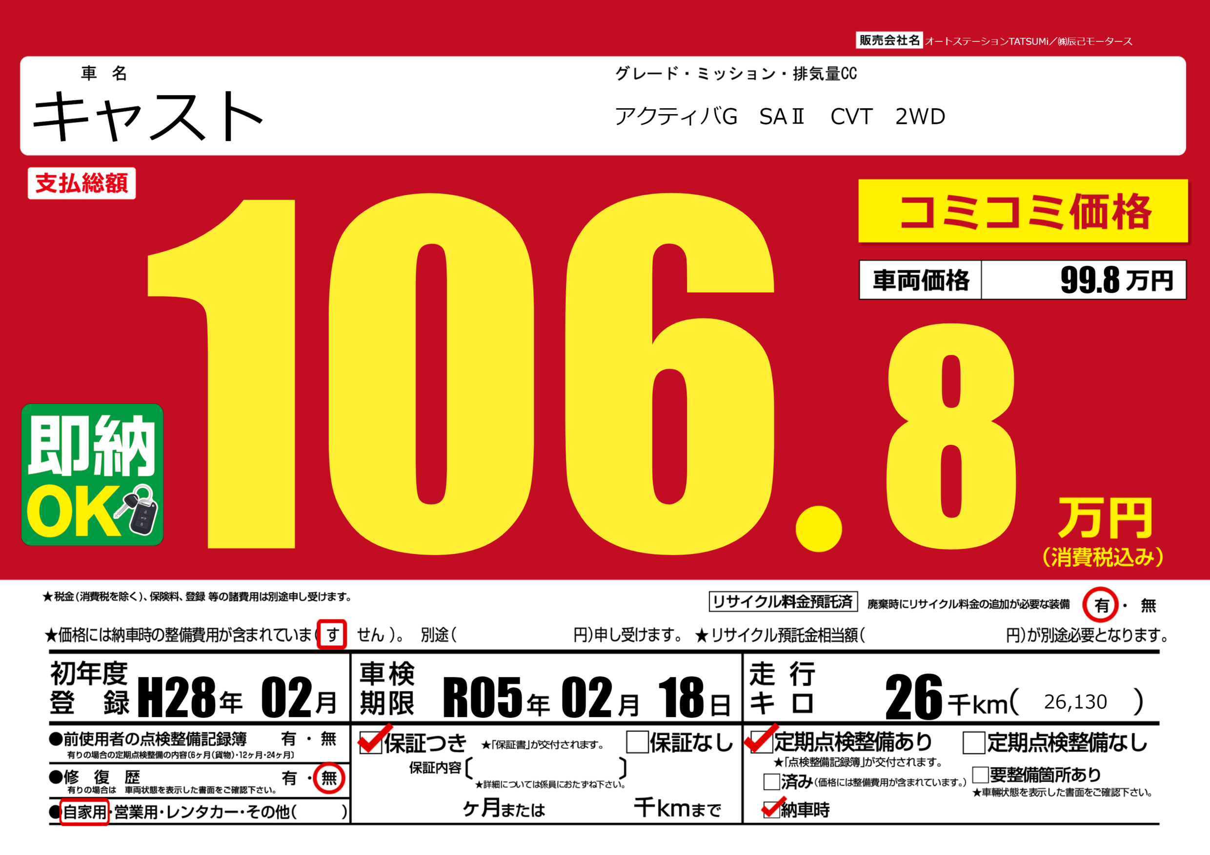 | 定期点検整備 | 定期点検整備あり 納車時あり | ||