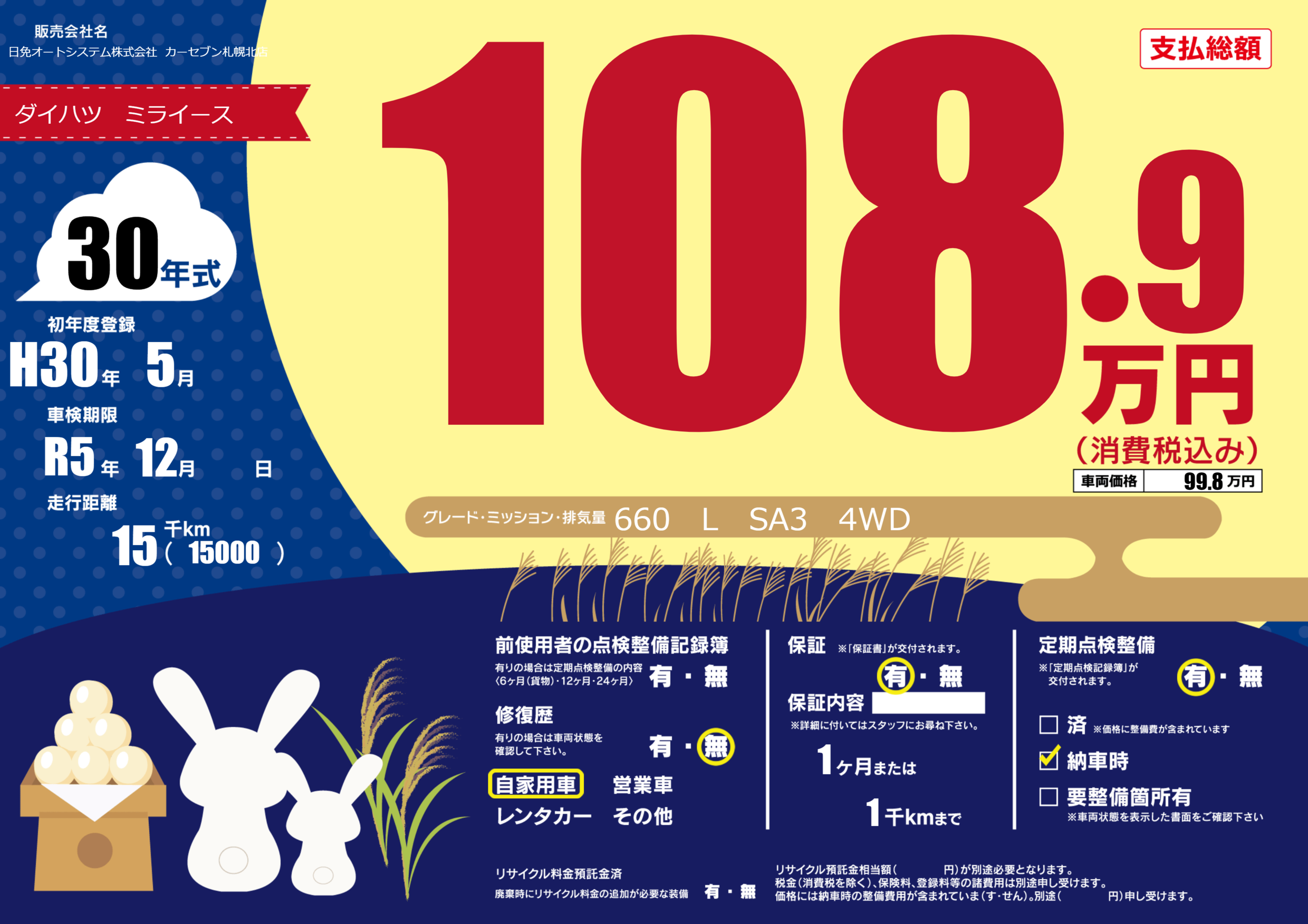 | 定期点検整備 | 定期点検整備あり 納車時あり | ||