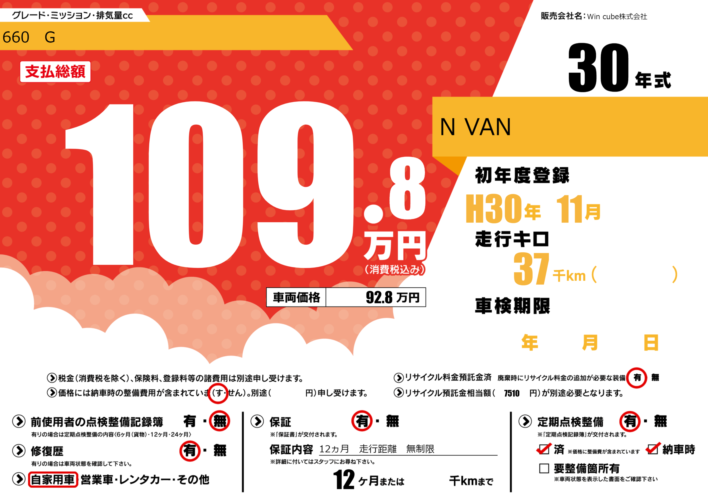 | 車名 | N VAN | グレード ミッション 排気量 |