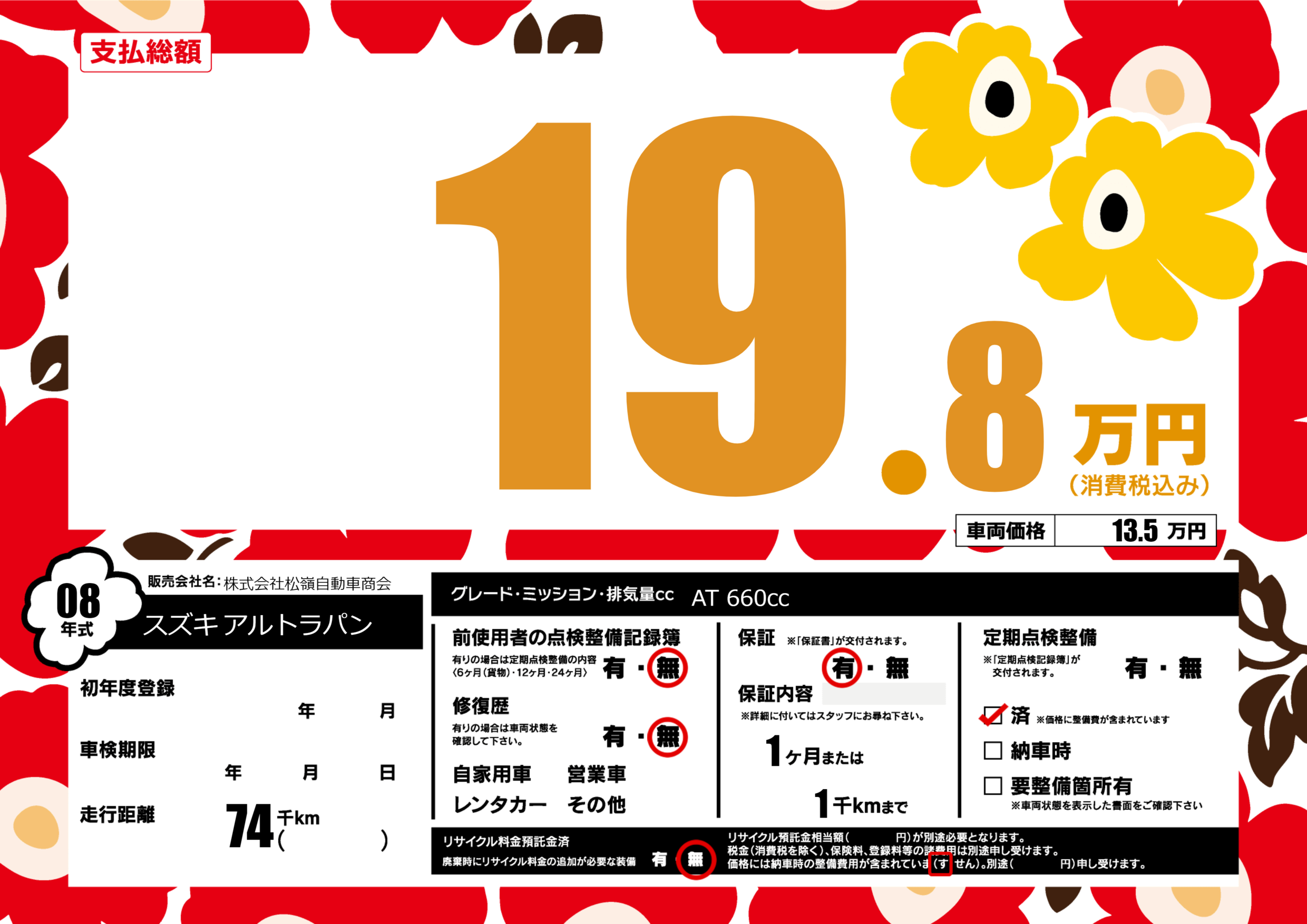 保証付き 保証内容(---) 1ヶ月または(1)千kmまで |