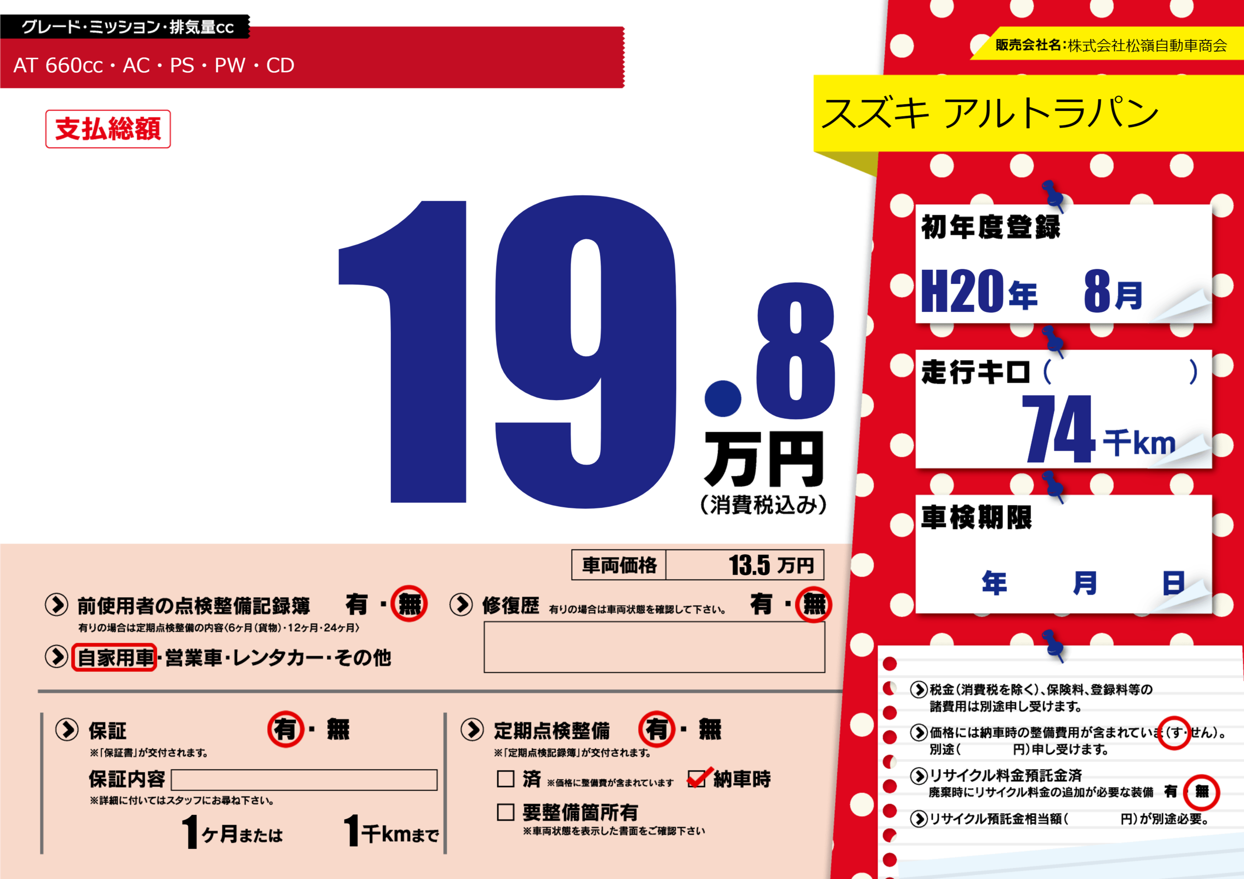 | 定期点検整備 | 定期点検整備あり 納車時あり | ||