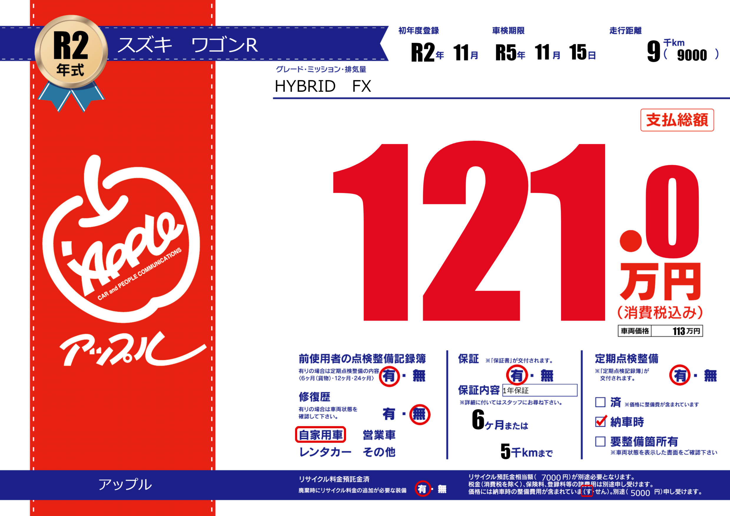 | 定期点検整備 | 定期点検整備あり 納車時あり | ||
