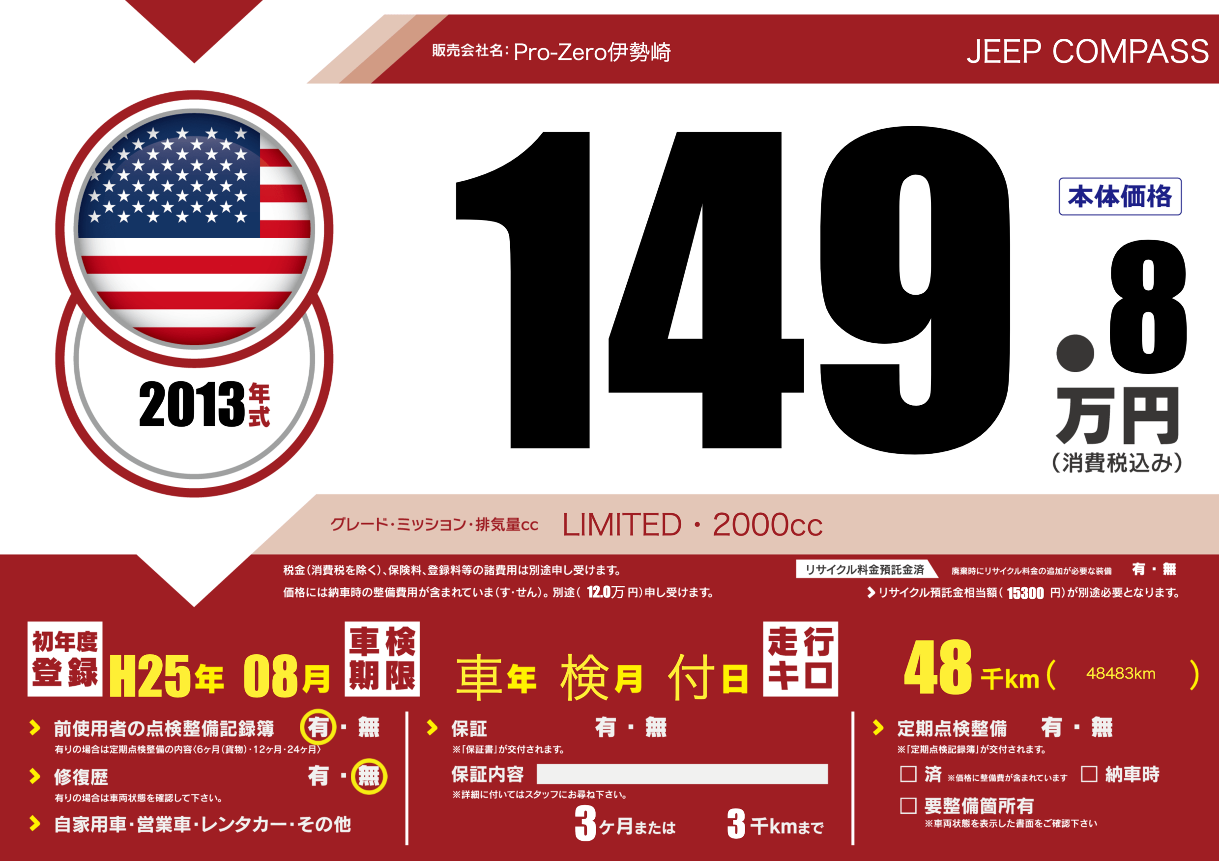 | 車名 | JEEP COMPASS | グレード ミッション 排気量 |