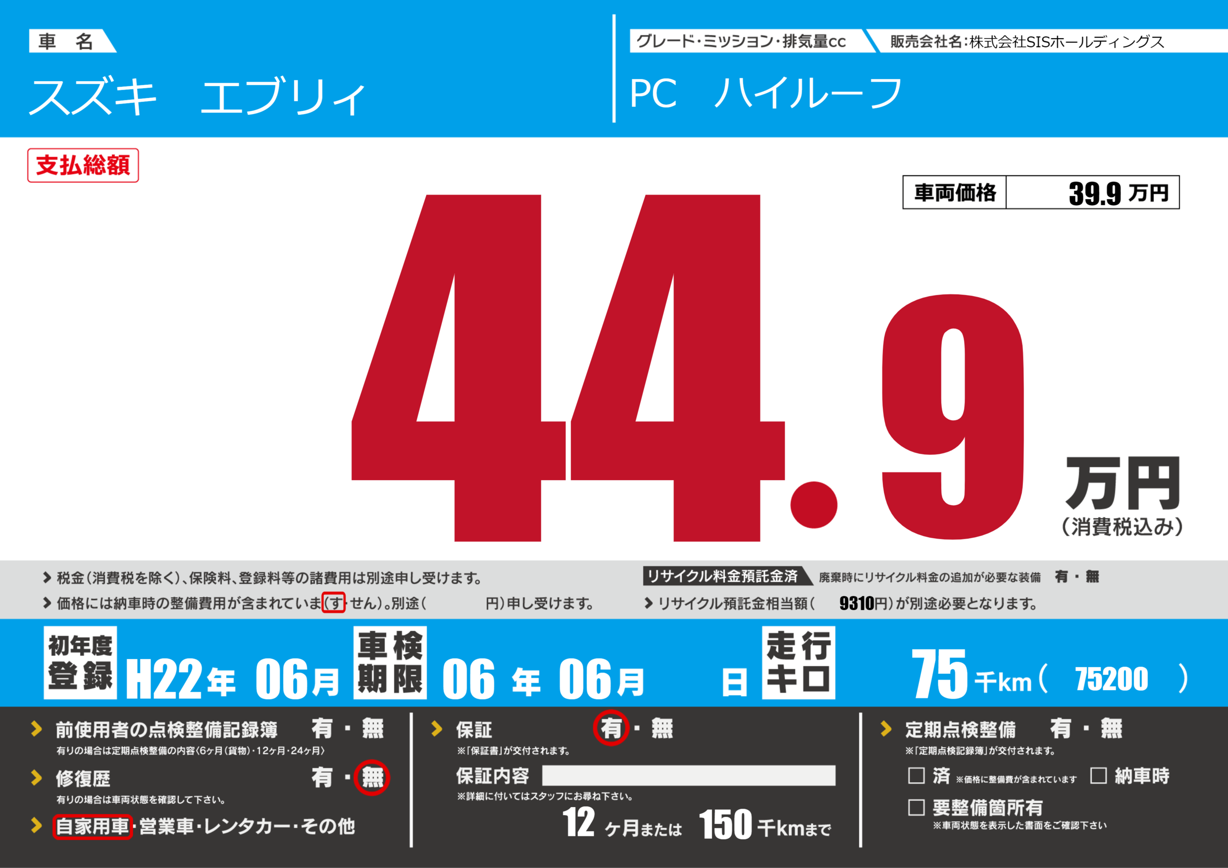 | 走行キロ | 7.5万km | 初年度登録 | H22年06月 |