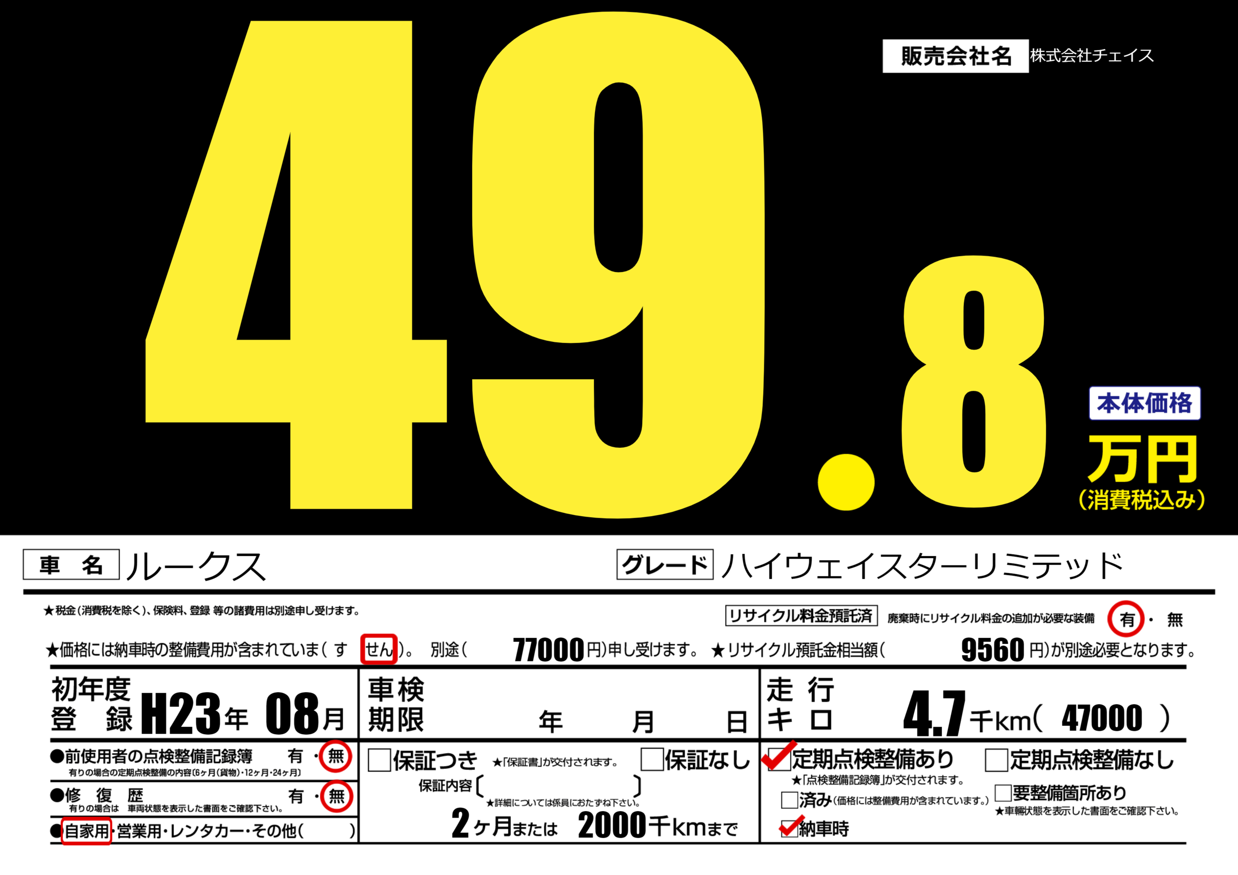 | 定期点検整備 | 定期点検整備あり 納車時あり | ||