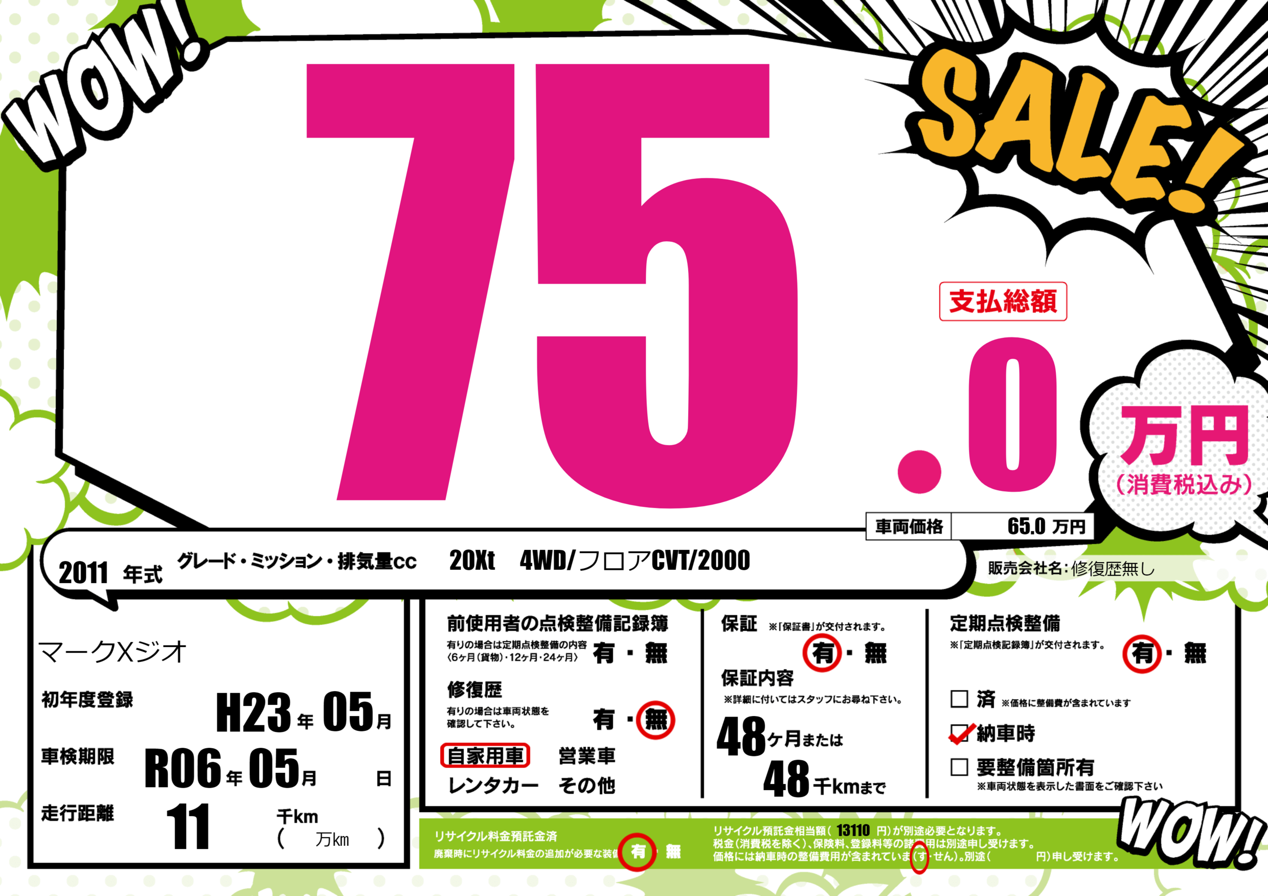 | 走行キロ | 1.1万km | 初年度登録 | H23年05月 |