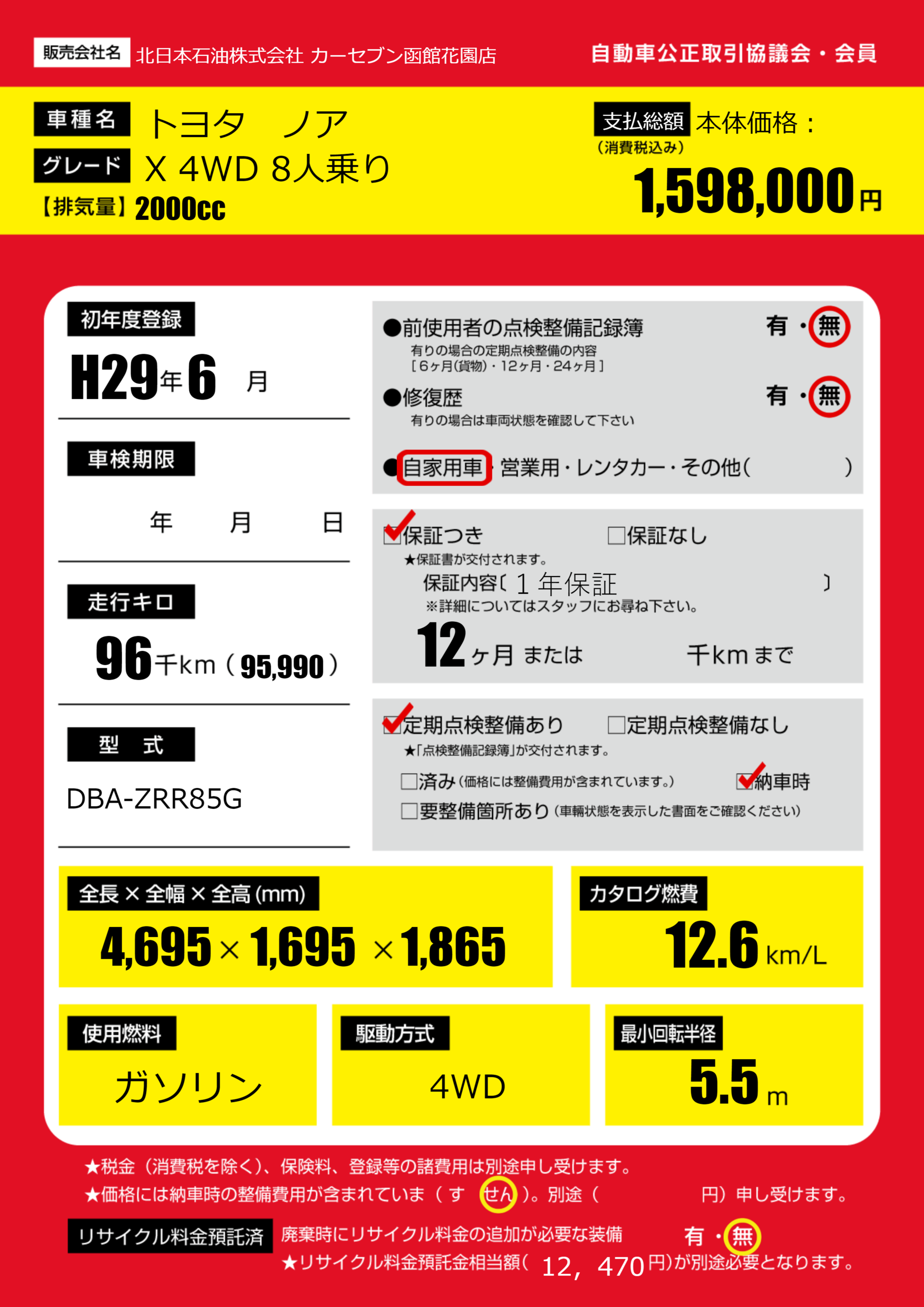 | 車名 | トヨタ ノア | グレード ミッション 排気量 |