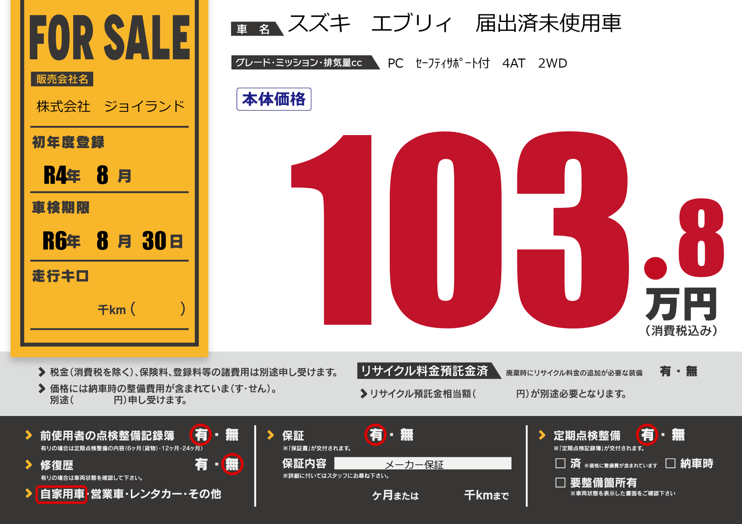 | 車名 | スズキ エブリィ 届出済未使用車 | グレード ミッション 排気量 |
