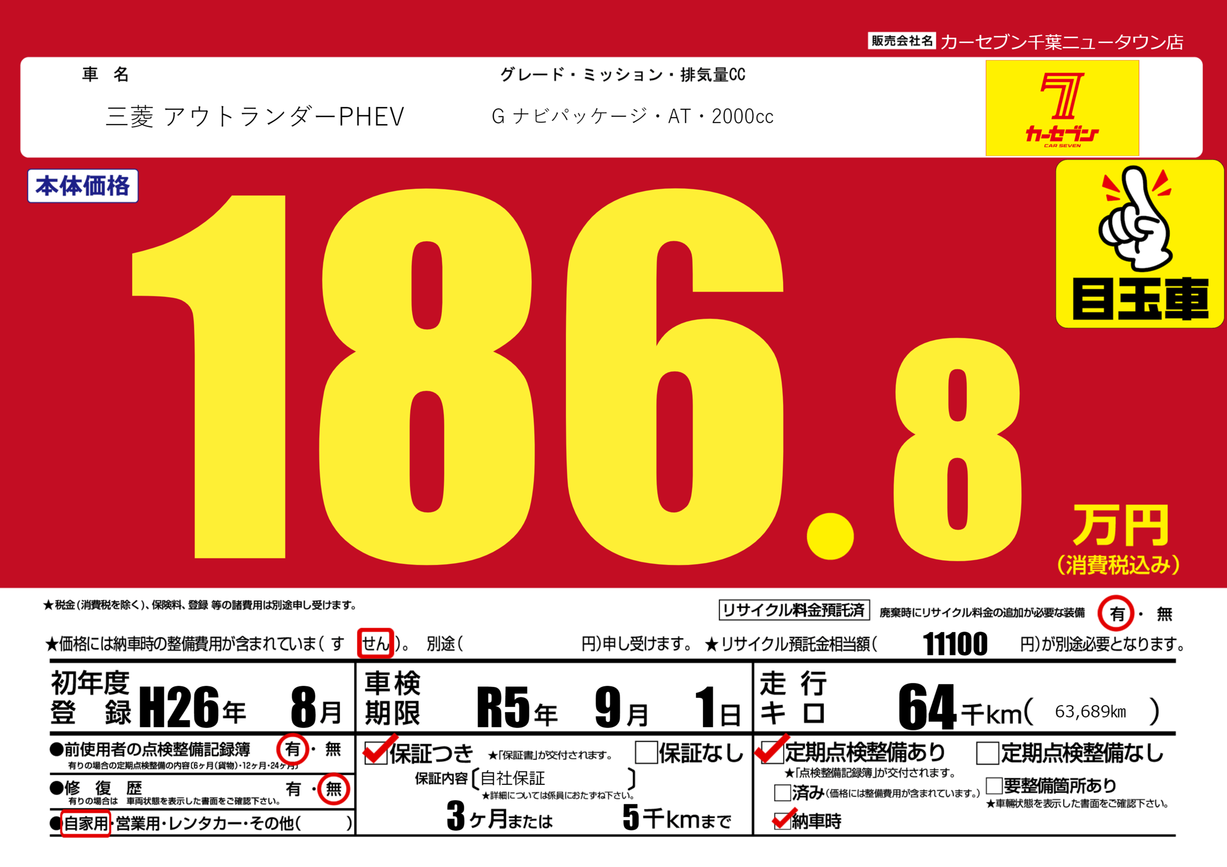 保証付き 保証内容(自社保証) 3ヶ月または(5)千kmまで |