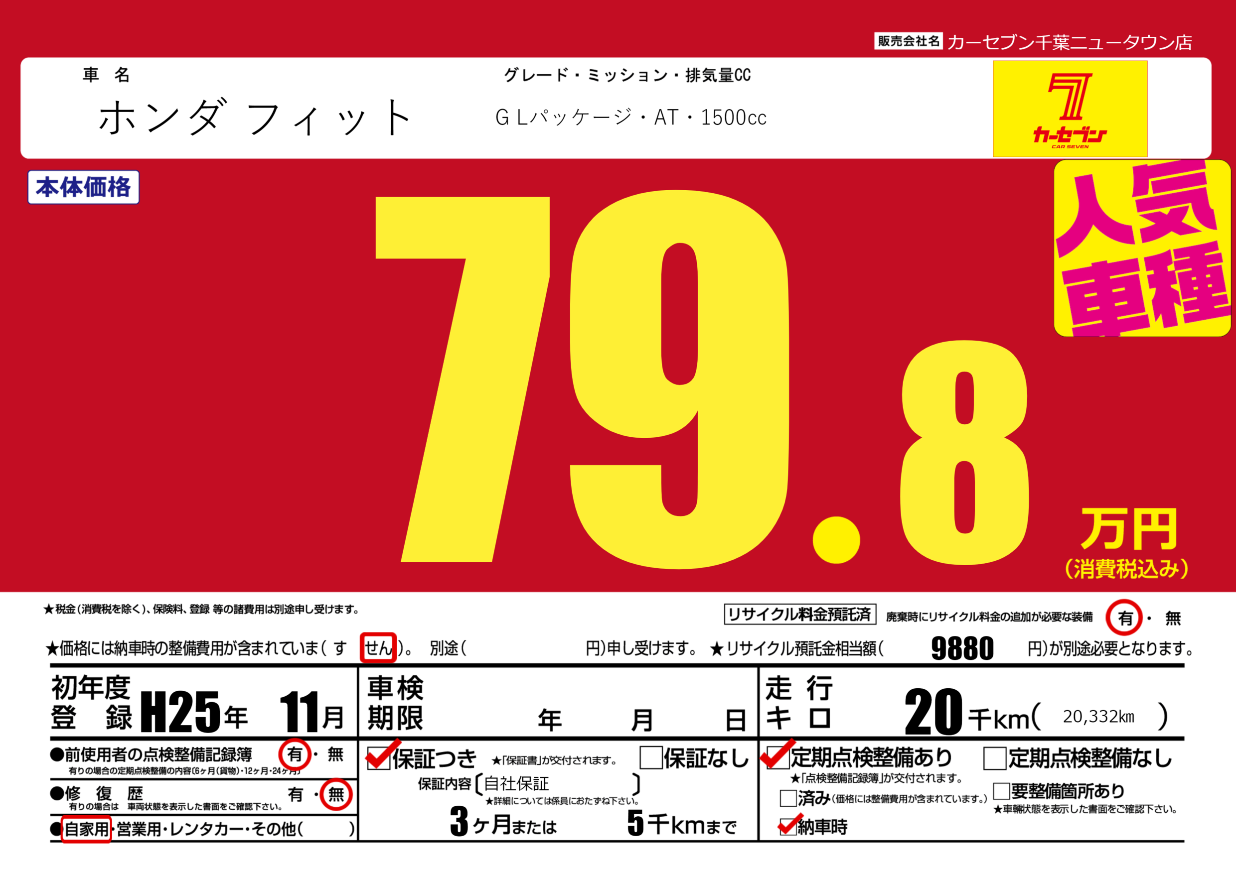 | 車名 | ホンダ フィット | グレード ミッション 排気量 |