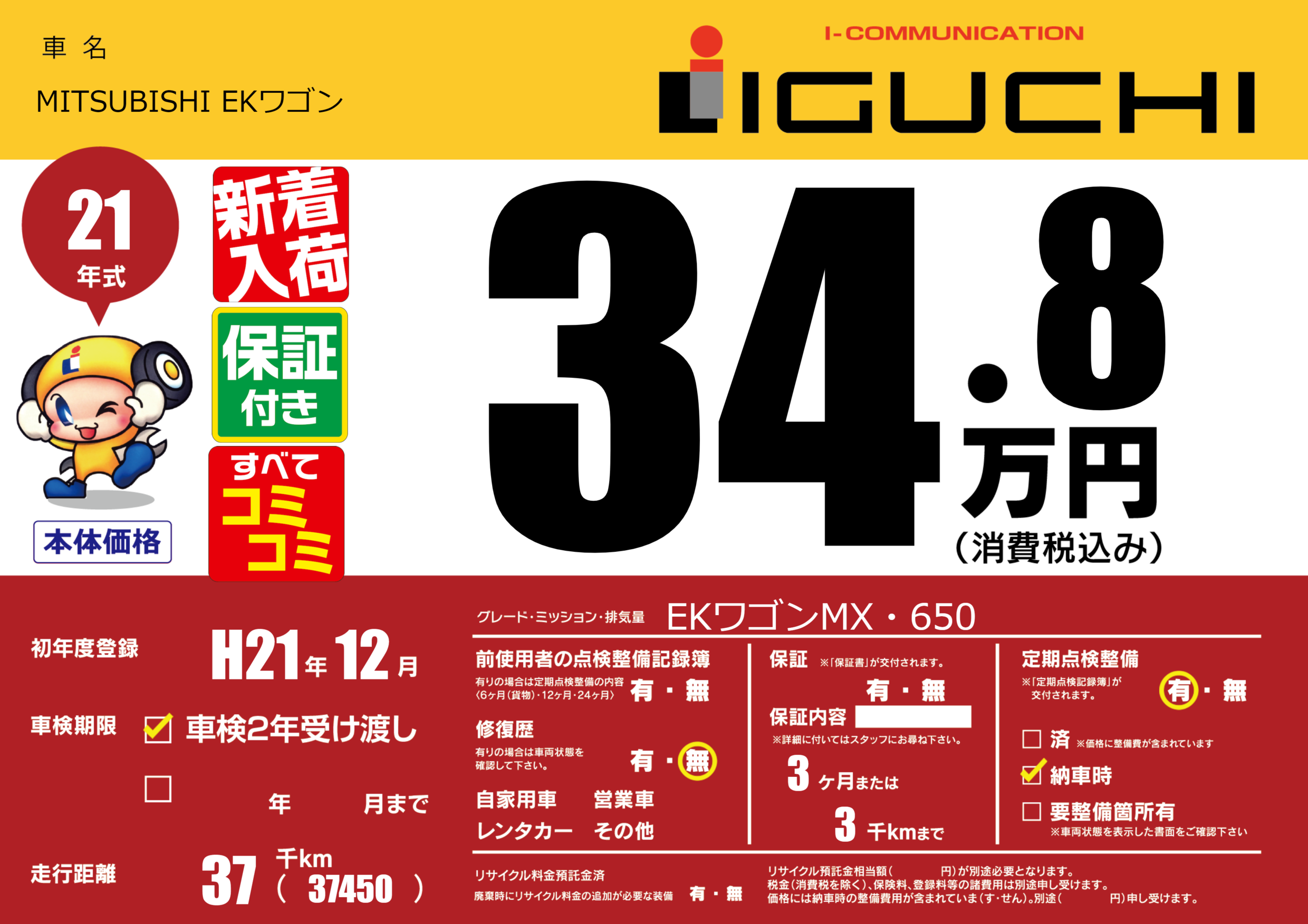 | 車名 | MITSUBISHI EKワゴン | グレード ミッション 排気量 |