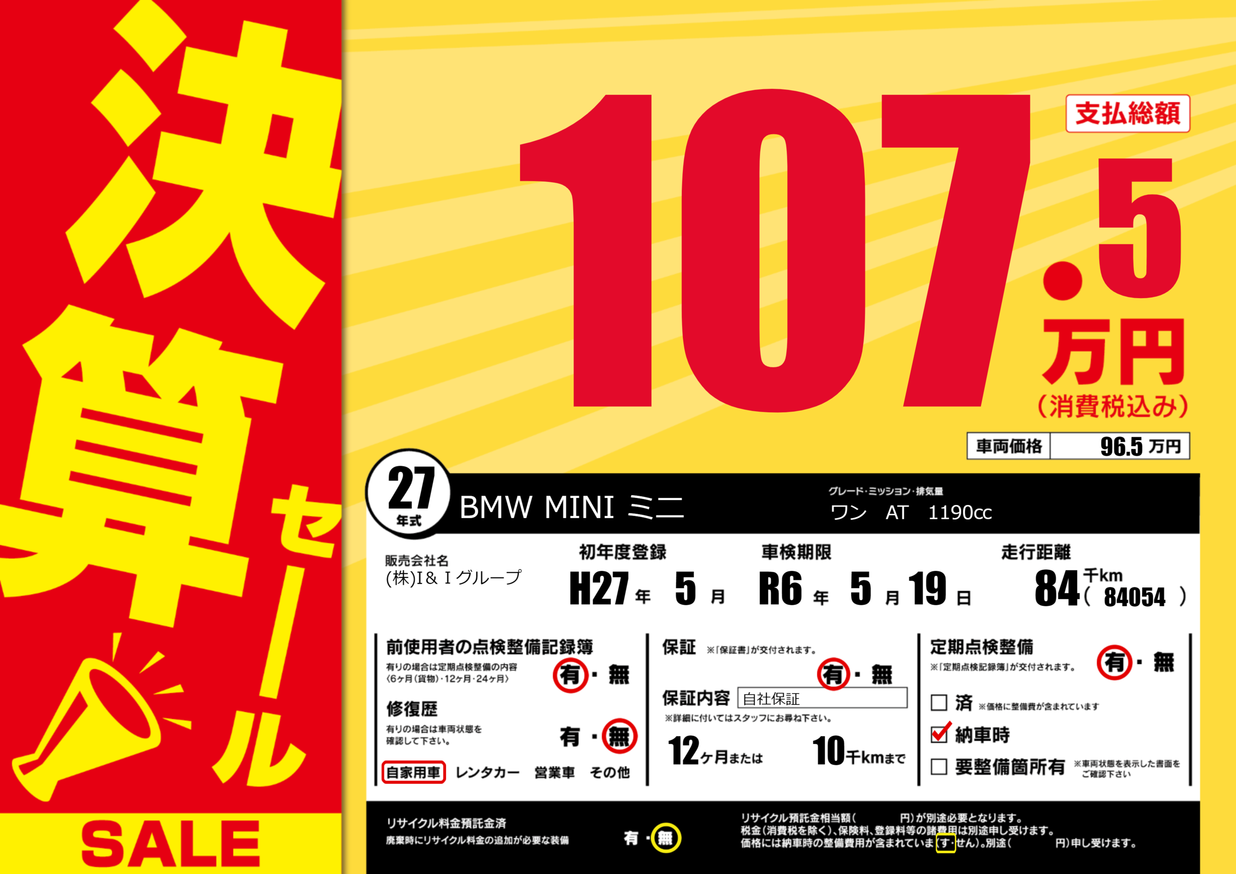 | 定期点検整備 | 定期点検整備あり 納車時あり | ||