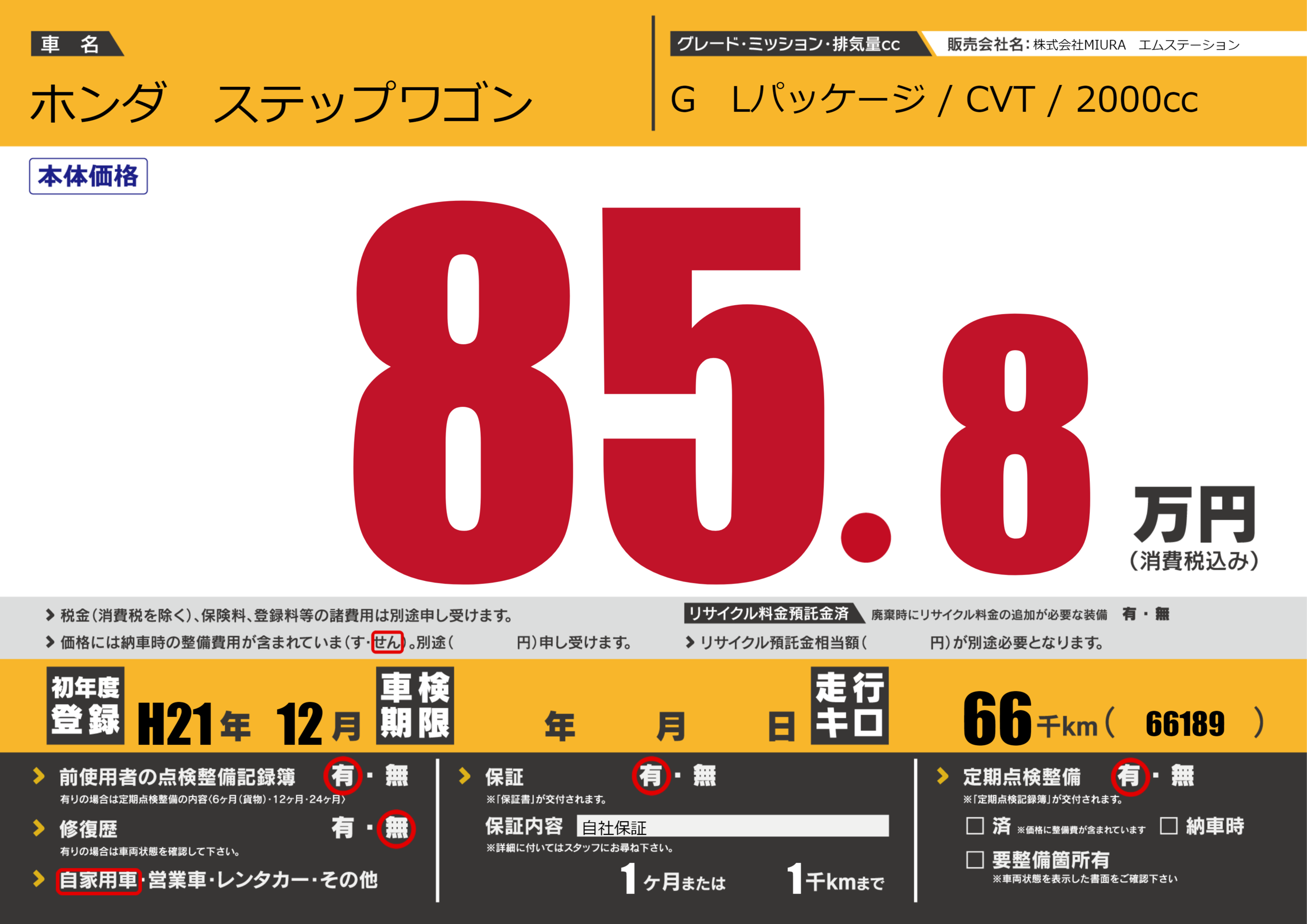 | 走行キロ | 6.6万km | 初年度登録 | H21年12月 |