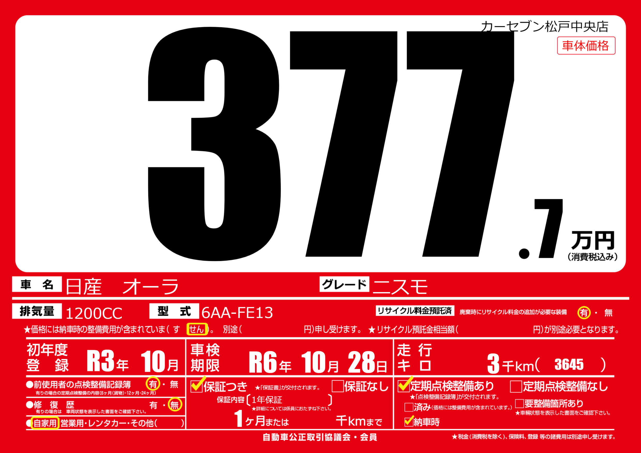 | 車名 | 日産 オーラ | グレード ミッション 排気量 |