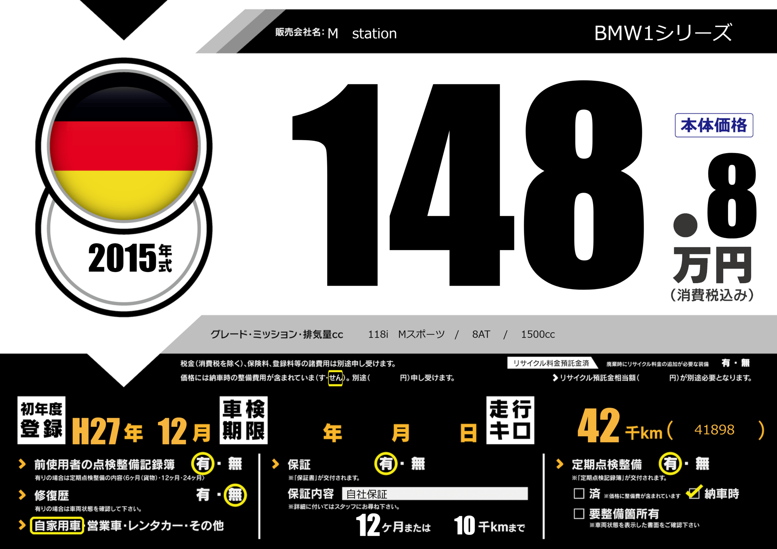 | 車名 | BMW1シリーズ | グレード ミッション 排気量 |