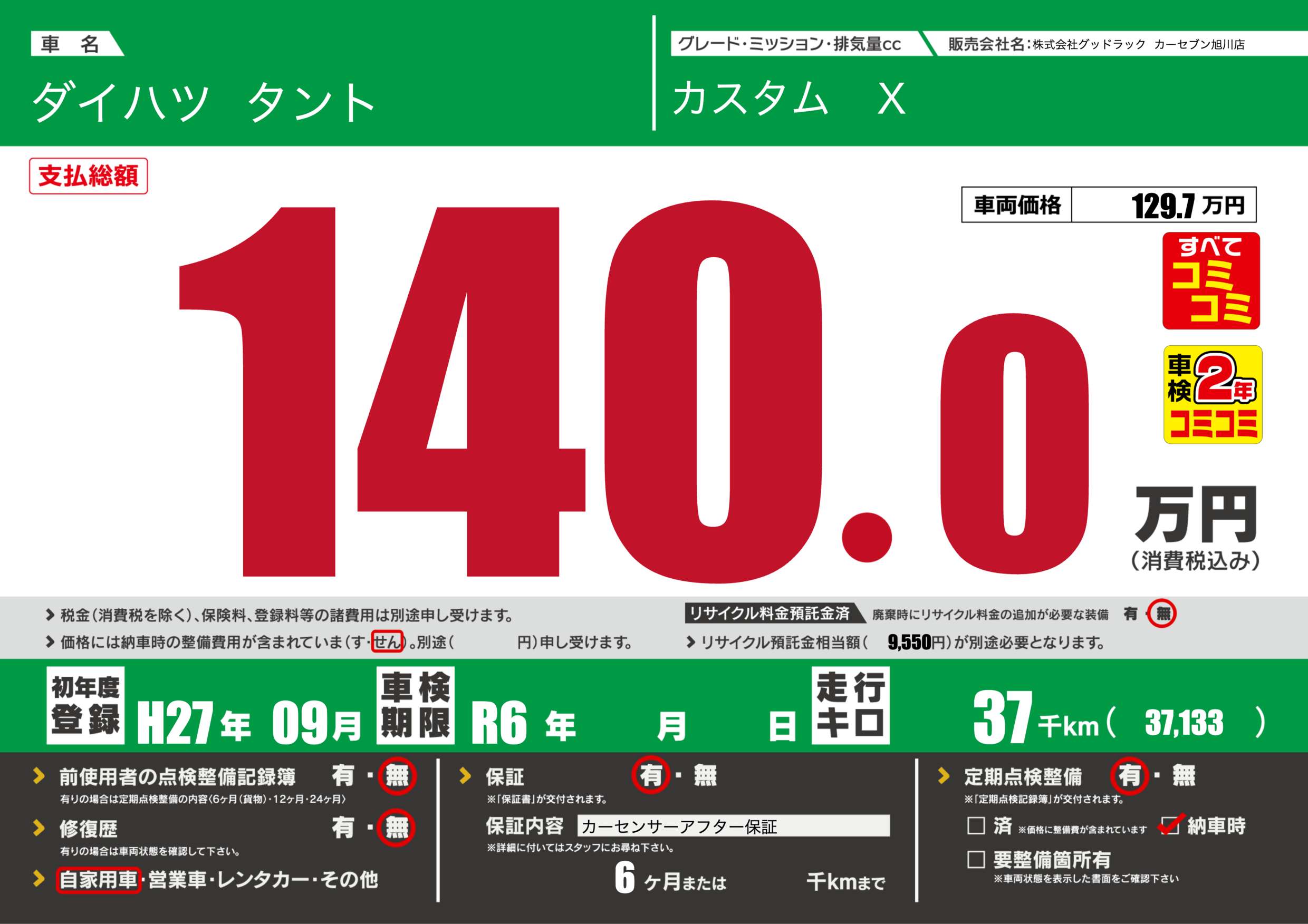 | 走行キロ | 3.7万km | 初年度登録 | H27年09月 |